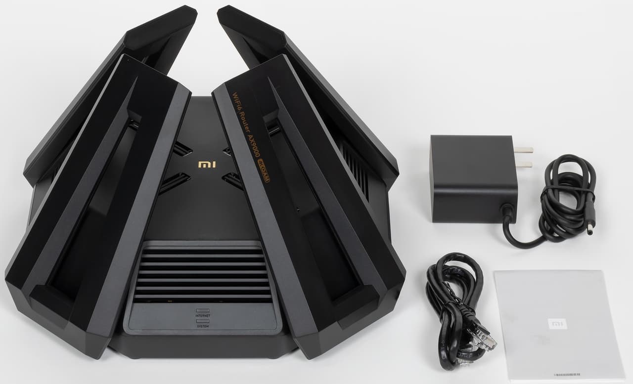 Тем не менее, «магия цифр» может работать, и сегодня в нашей лаборатории «чистокровный китаец» Xiaomi AX9000 стоимостью около $200. По названию понятно, что эта модель имеет поддержку Wi-Fi 6 (802.11ax), а также является «трехдиапазонной» — на ней можно создать одновременно две точки доступа в диапазоне 5 ГГц, работающие на разных каналах. В целом производитель вынес на коробку дюжину основных привлекательных особенностей модели: очень быстрый Wi-Fi, шестиядерный процессор, оптимизация для игр, 12-канальный усилитель сигнала, поддержка полосы 160 МГц, сетевой порт 2,5 Гбит/с, поддержка кодирования QAM, порт USB 3.0, обнаружение устройств домашней автоматизации Xiaomi, ускорение мобильных игр, система Mesh, динамическая подсветка RGB.