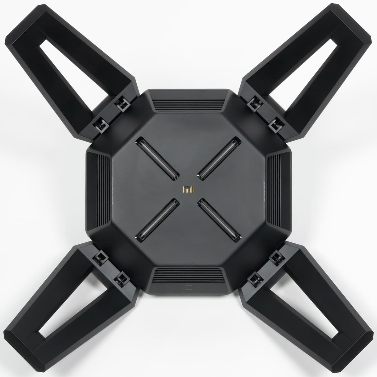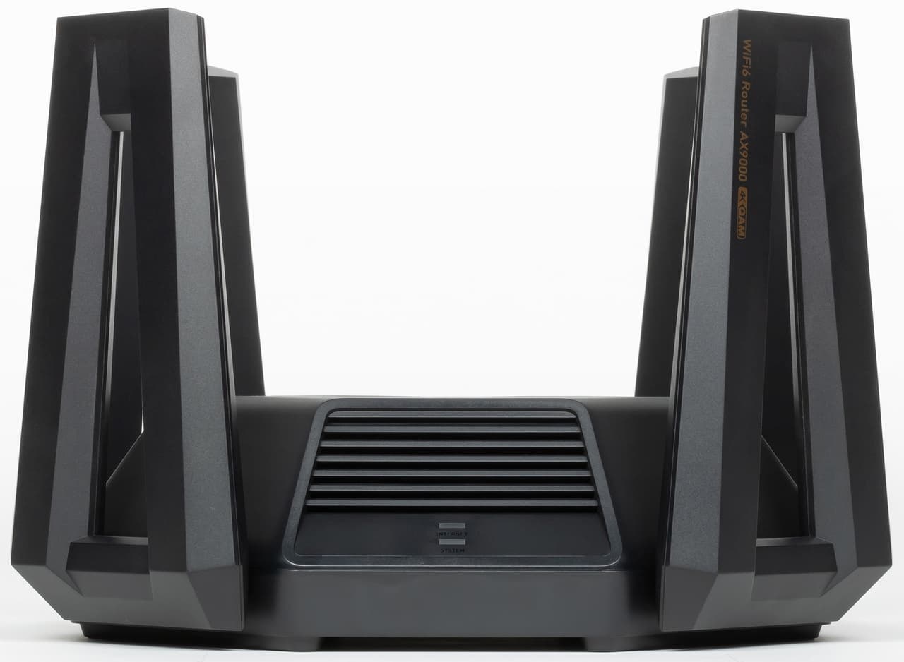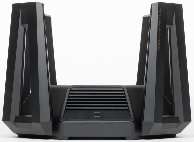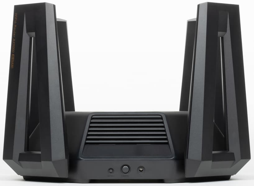 Все три радиомодуля работают на базе отдельных микросхем и в конфигурации 4×4. В каждой из четырех антенн установлено по три плоских антенны для каждого из «трех» диапазонов. При этом для модуля на 2,4 ГГц (чип QCN5024) максимальная скорость подключения составляет 1148 Мбит/с (с 802.11ax и каналом 40 МГц), для первого модуля 5 ГГц (чип QCN9024) с поддержкой каналов 36—64 — 4804 Мбит/с (802.11ax, канал 160 МГц), для второго модуля 5 ГГц (чип QCN5054) с поддержкой каналов 149—165 — 2402 Мбит/с (802.11ax, канал 80 МГц). Все основные радиомодули используют усилители FEM. Итого частотная формула 1148+2402+4804=8354 немного недотягивает до заявленных AX9000. Недостающие 433 Мбит/с обеспечиваются выделенным беспроводным модулем AIoT (чип QCA9889), который имеет одну антенну и поддержку 802.11ac. Сама антенна в данном случае встроенная и находится в области фронтальных индикаторов.