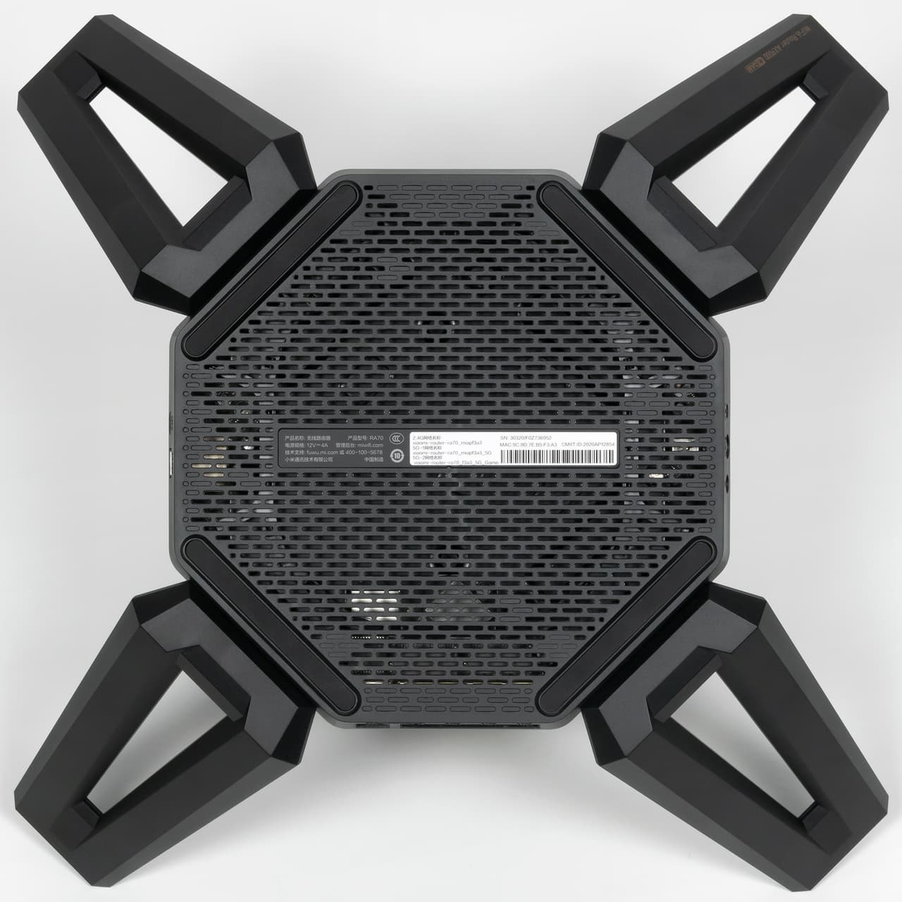 Кроме того, для вентиляции есть решетки на боковых гранях и на дне. Снизу мы также видим крупные резиновые ножки и информационную наклейку с именами беспроводных сетей, серийным номером и MAC-адресом.