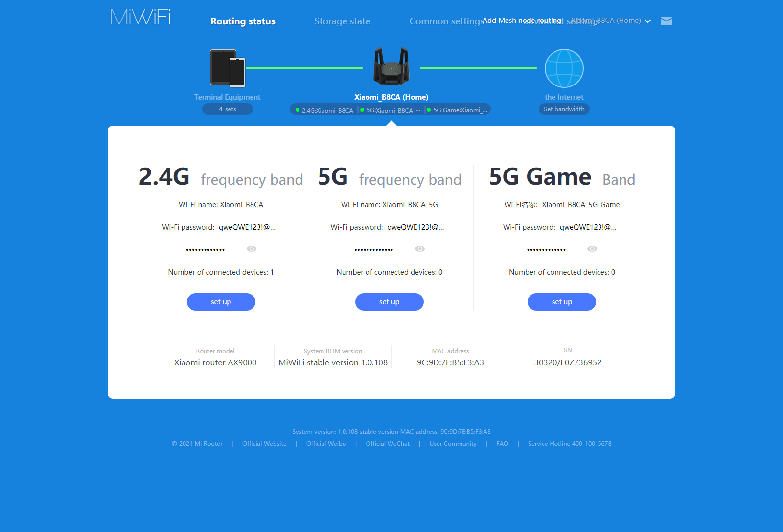 Первая страница — статус роутера. На основной ее закладке мы видим роутер с указанием имен и паролей беспроводных сетей. В нижней строке — название модели, версия прошивки, MAC-адрес и серийный номер.