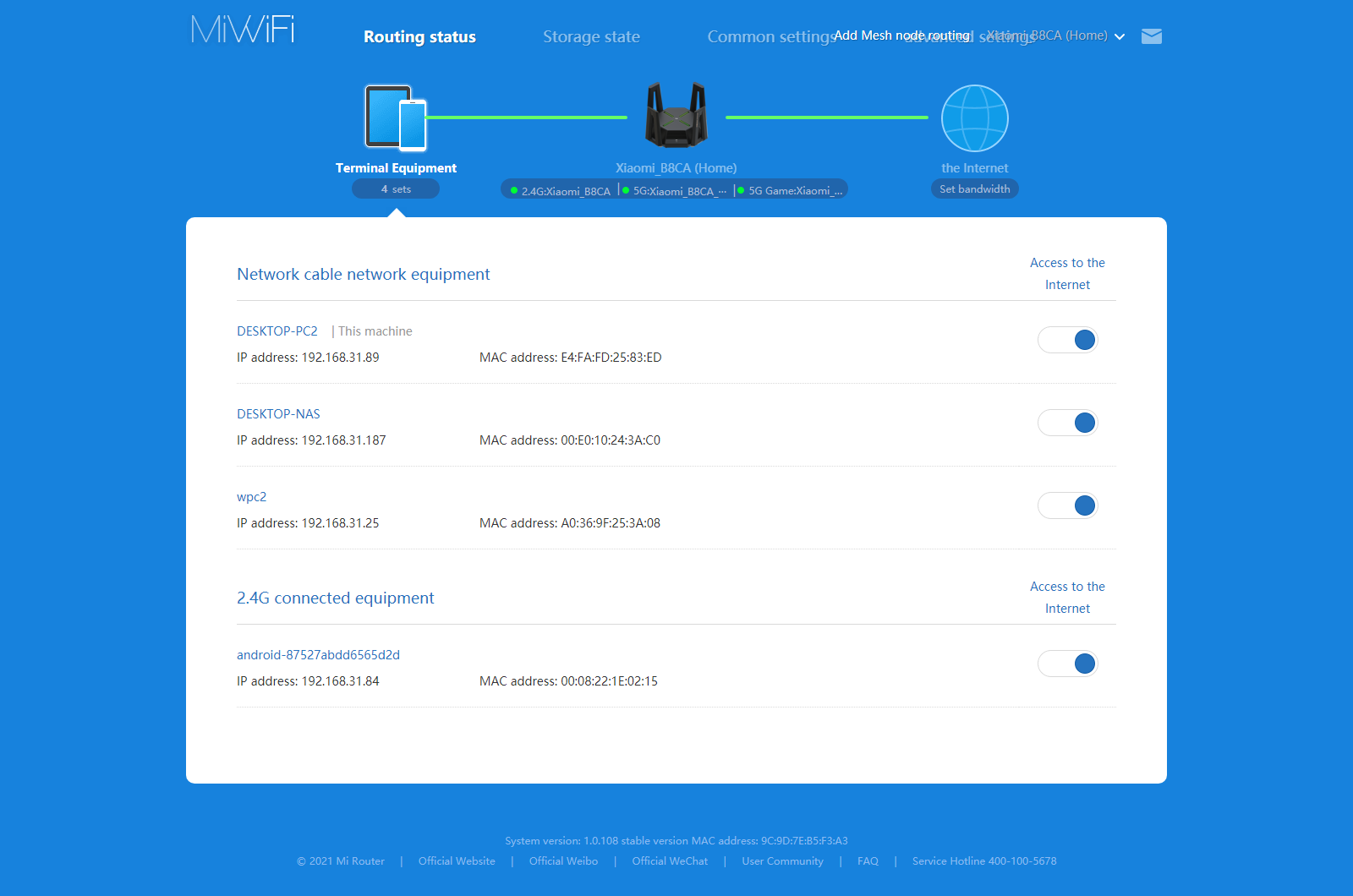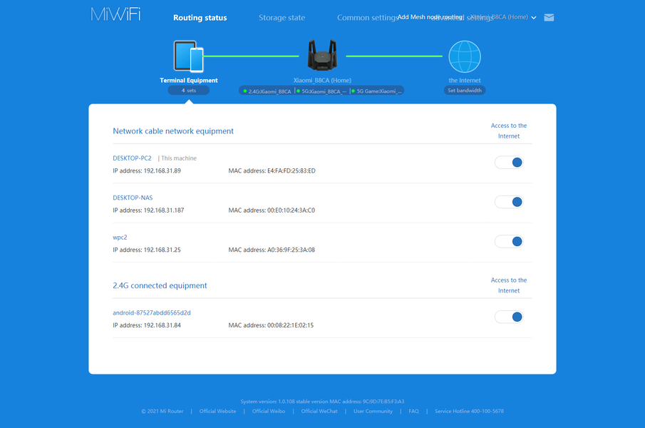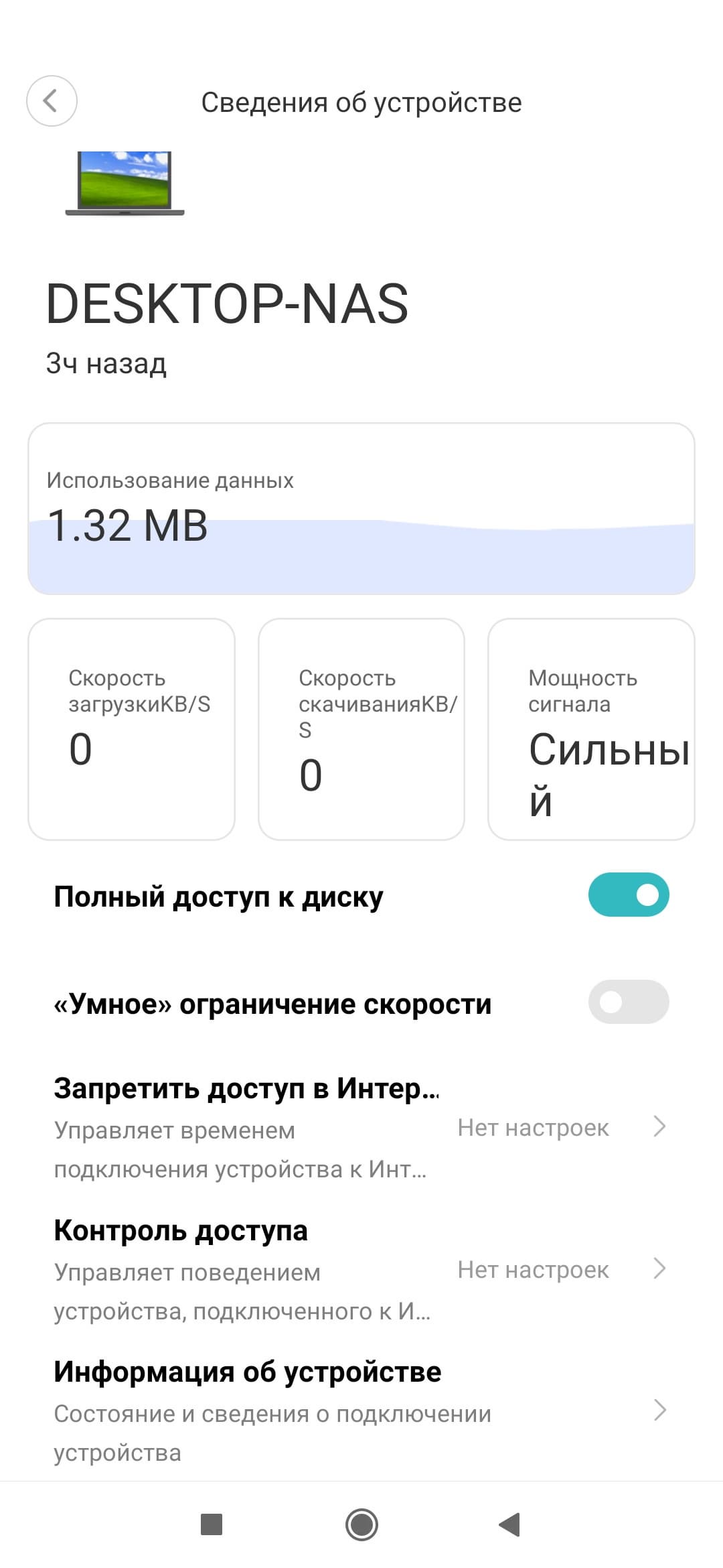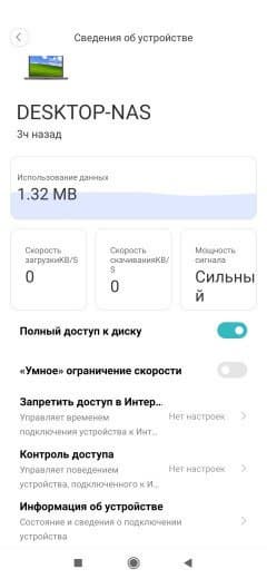 Следом идет раздел управления клиентами локальной сети. Кроме данных о трафике и текущих скоростях, блокировки доступа к интернету, настройки черного/белого списков доступа к сайтам и ограничения скоростей, мы видим здесь галочку «Полный доступ к диску». При ее активации, с данного клиента можно будет увидеть полностью все подключенные к роутеру тома. Вводить имя или пароль не потребуется. Имена общих папок будут в формате «XiaoMi-usb0», где цифра в конце — номер тома. Если эту галочку не включать, то пользователь сможет иметь доступ только к двум автоматически создаваемым на первом доступном томе папкам с китайскими именами, которые переводятся как «загрузки» и «общие файлы». Наконец удалось немного продвинуться с вопросом общего доступа к файлам. Жаль только, что в схеме работы не предусмотрено никаких управления правами.