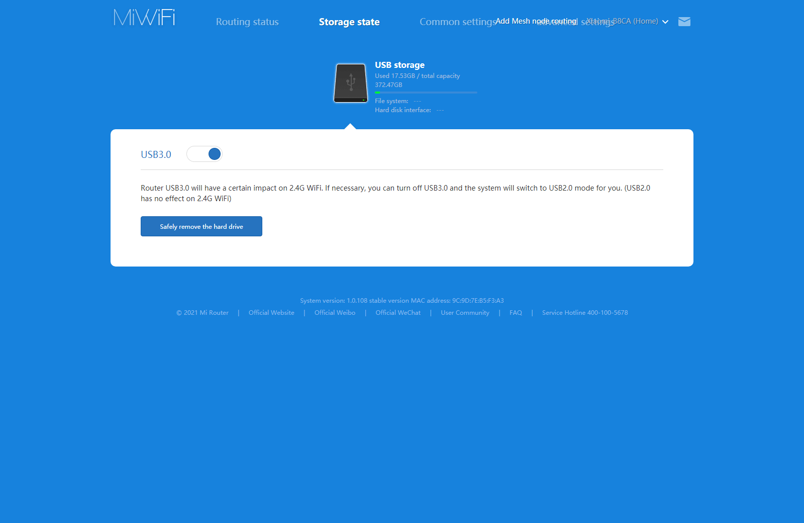 Следующая страница не очень понятно зачем была выделена в одну группу — на ней можно только отключить режим USB 3.0 из-за потенциального влияния на работу беспроводных устройств в диапазоне 2,4 ГГц. Плюс в верхней части страницы представлена некоторая информация о подключенном USB-накопителе, а также есть кнопка для его безопасного отключения.