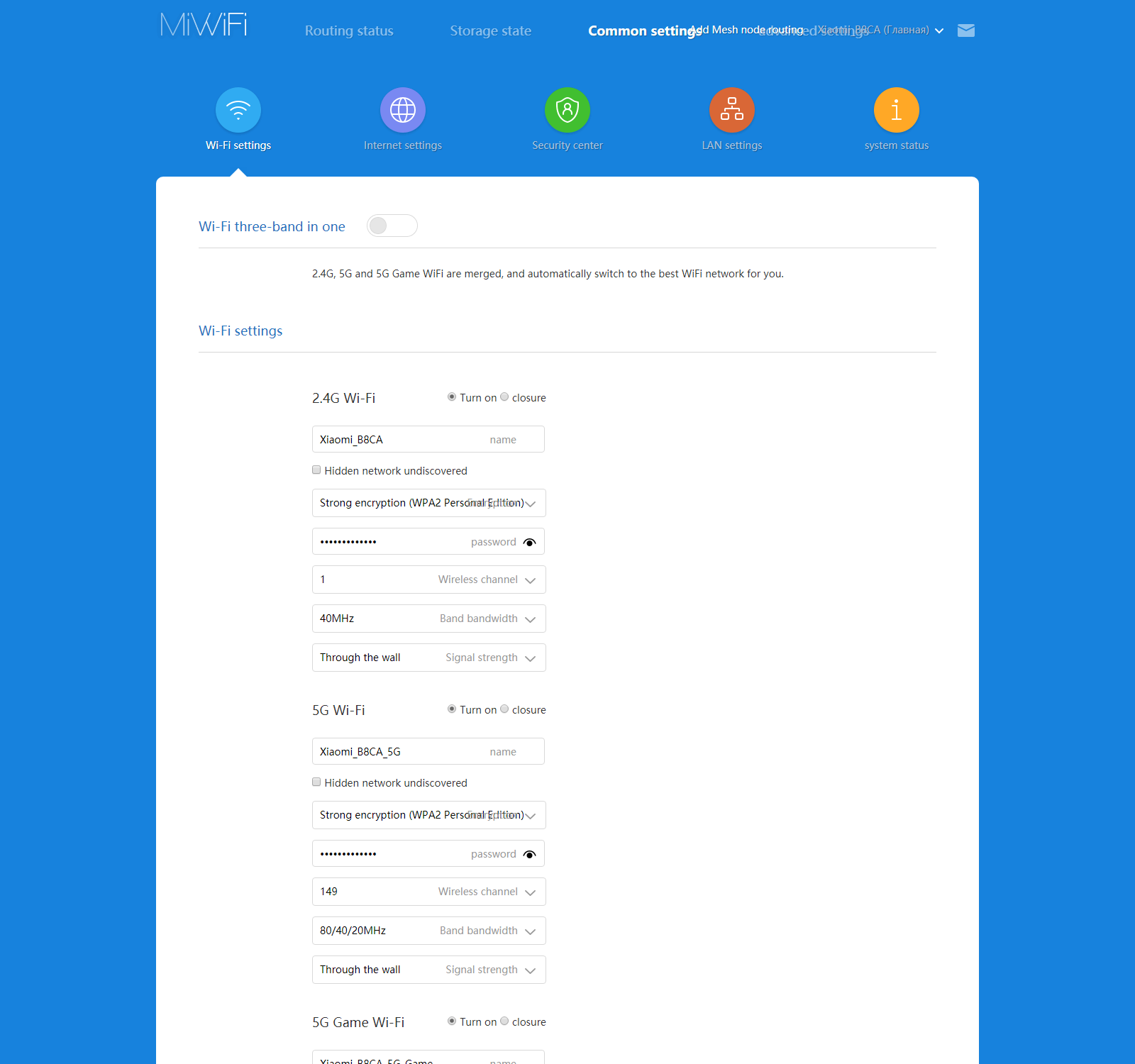 Раздел основных настроек состоит из пяти страниц. На первой настраиваются параметры беспроводных точек доступа независимо для каждого диапазона. Кроме имени, режима защиты и пароля, можно выбрать номер и ширину канала, а также мощность передатчика. Поддерживается режим с одним именем сети с автоматическим выбором лучшей, но с учетом очень разных характеристик точек доступа, большинству будет удобнее иметь разные конфигурации и самостоятельно решать какого клиента куда подключать.