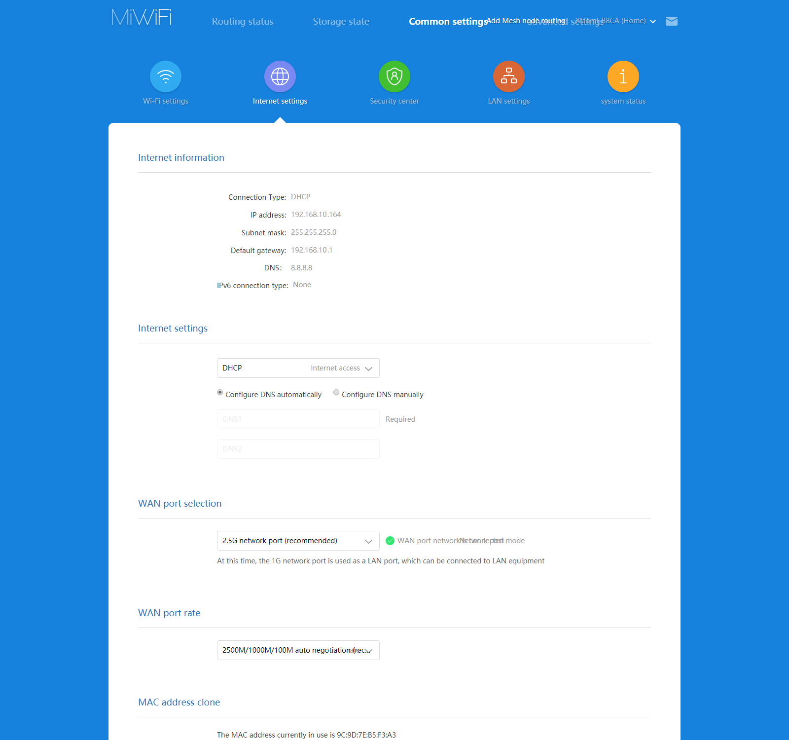 Настройки подключения к интернету несложные. Штатно поддерживаются режимы фиксированного или динамического адреса, а также клиент PPPoE. Предусмотрена возможность смены MAC-адреса порта, выбор его скорости, активация протокола IPv6. На этой же странице выбирается режим порта 2,5 Гбит/с: он может выступать в роли WAN (по умолчанию), или же WAN можно переназначить на один из гигабитных портов, освободив быстрый порт для локального сегмента сети. Еще одна важная опция на этой странице — переключение режима из роутера в повторитель.