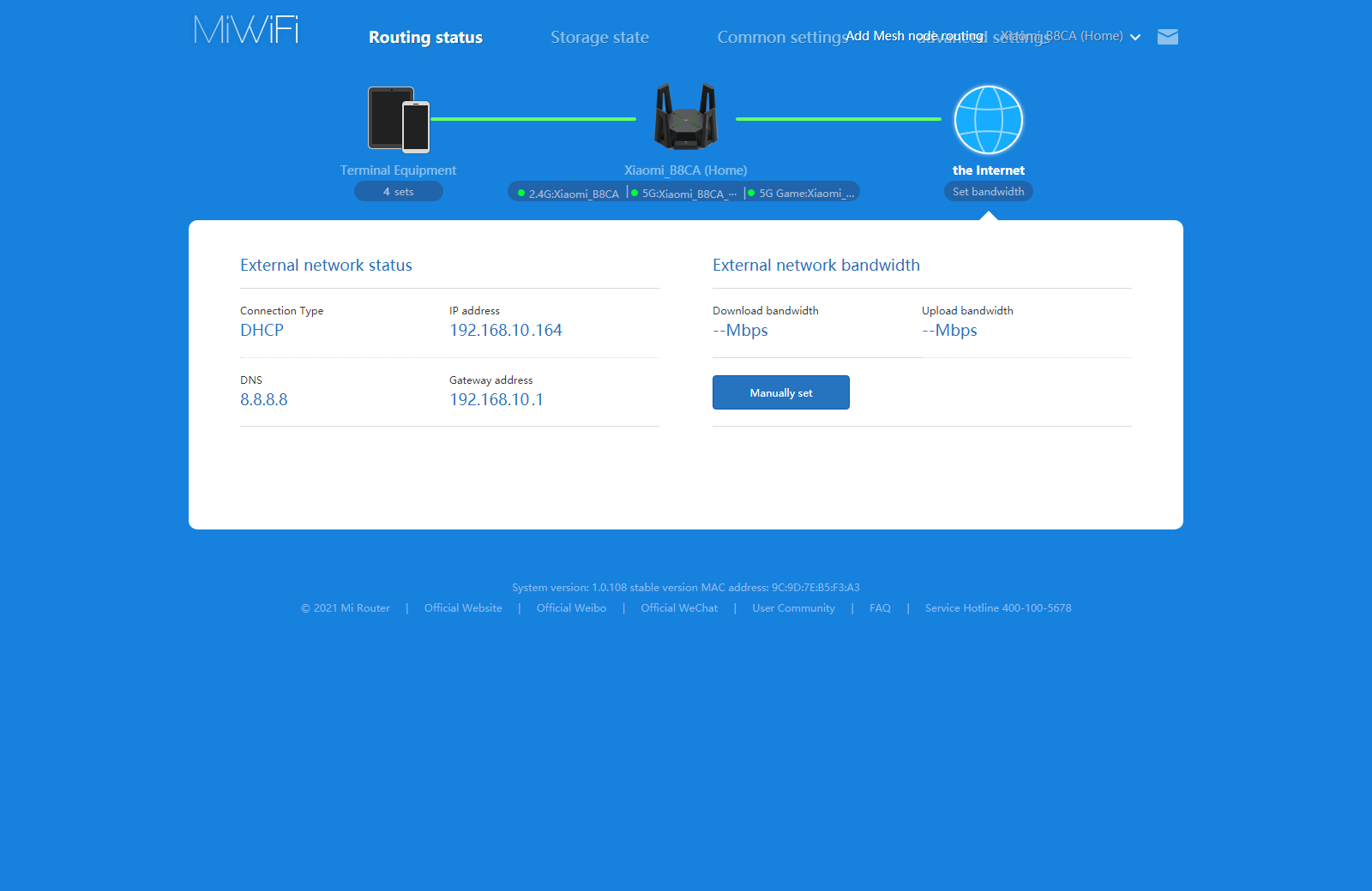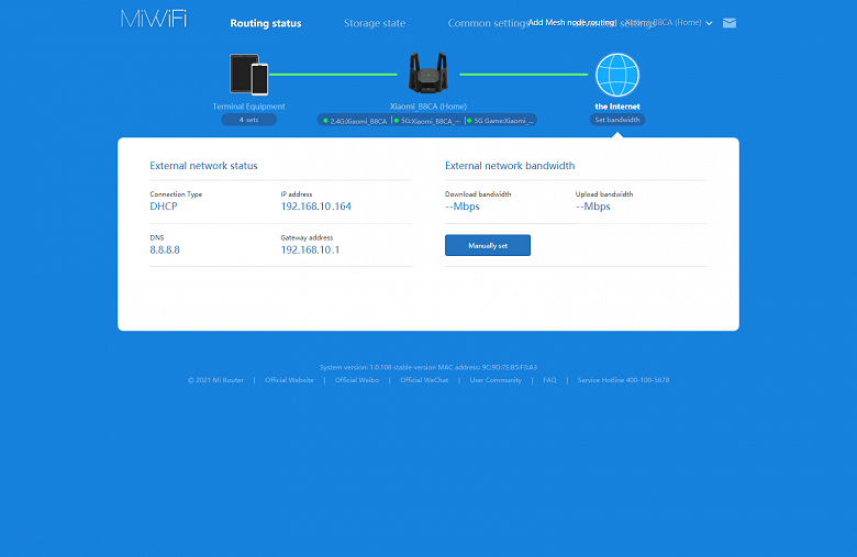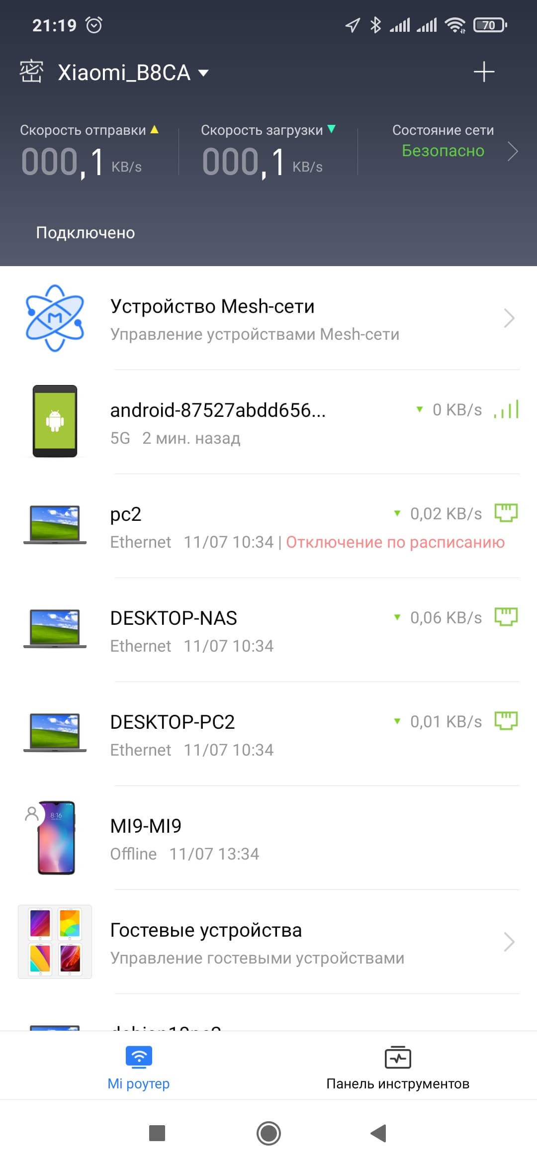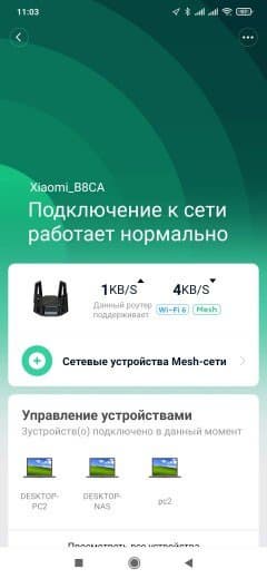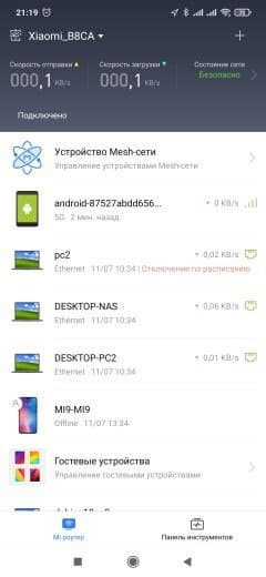 На главном экране Mi WiFi в верхней части мы видим текущие скорости приема и передачи данных роутером и общий статус состояния сети. Ниже идет пункт для настройки Mesh-системы и за ним список подключенных клиентов.