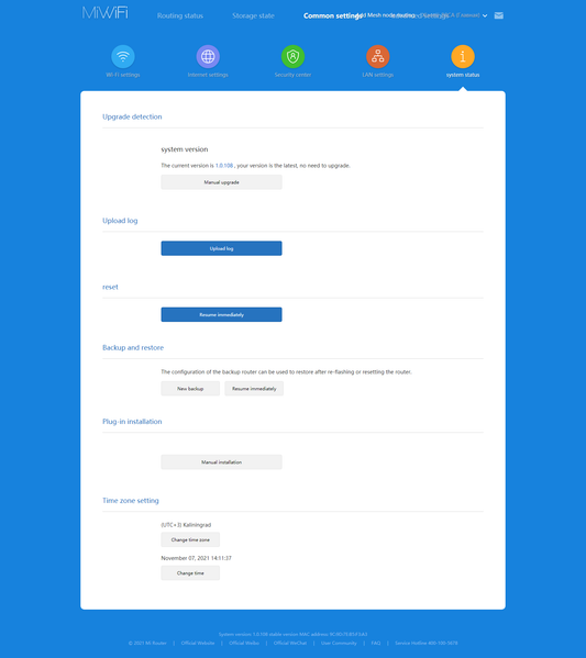 Последняя страница в этой группе — обновление прошивки, перезагрузка, резервное копирование и восстановление конфигурации, настройка часов. Есть также пункт установки плагинов из файла, но что конкретно можно с этим делать — не очень понятно.
