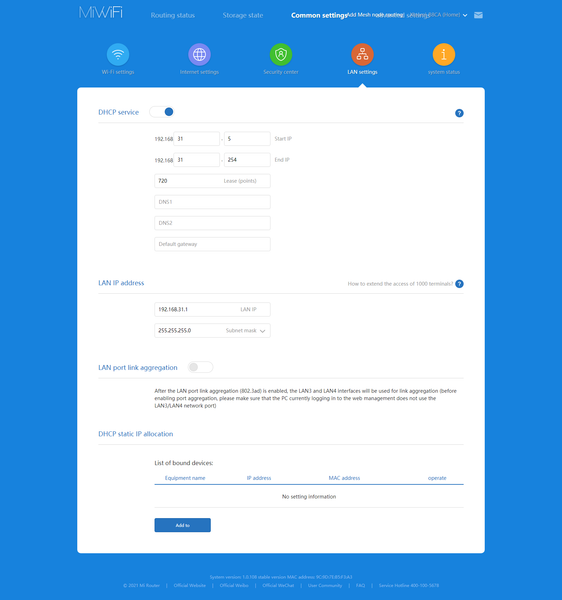 Для локального сегмента сети можно выбрать собственный адрес роутера, установить диапазон адресов для раздачи клиентам по DHCP, указать фиксированные назначения MAC—IP. Плюс здесь есть настройка режима объединения портов 3 и 4 с использованием 802.3ad/LACP.