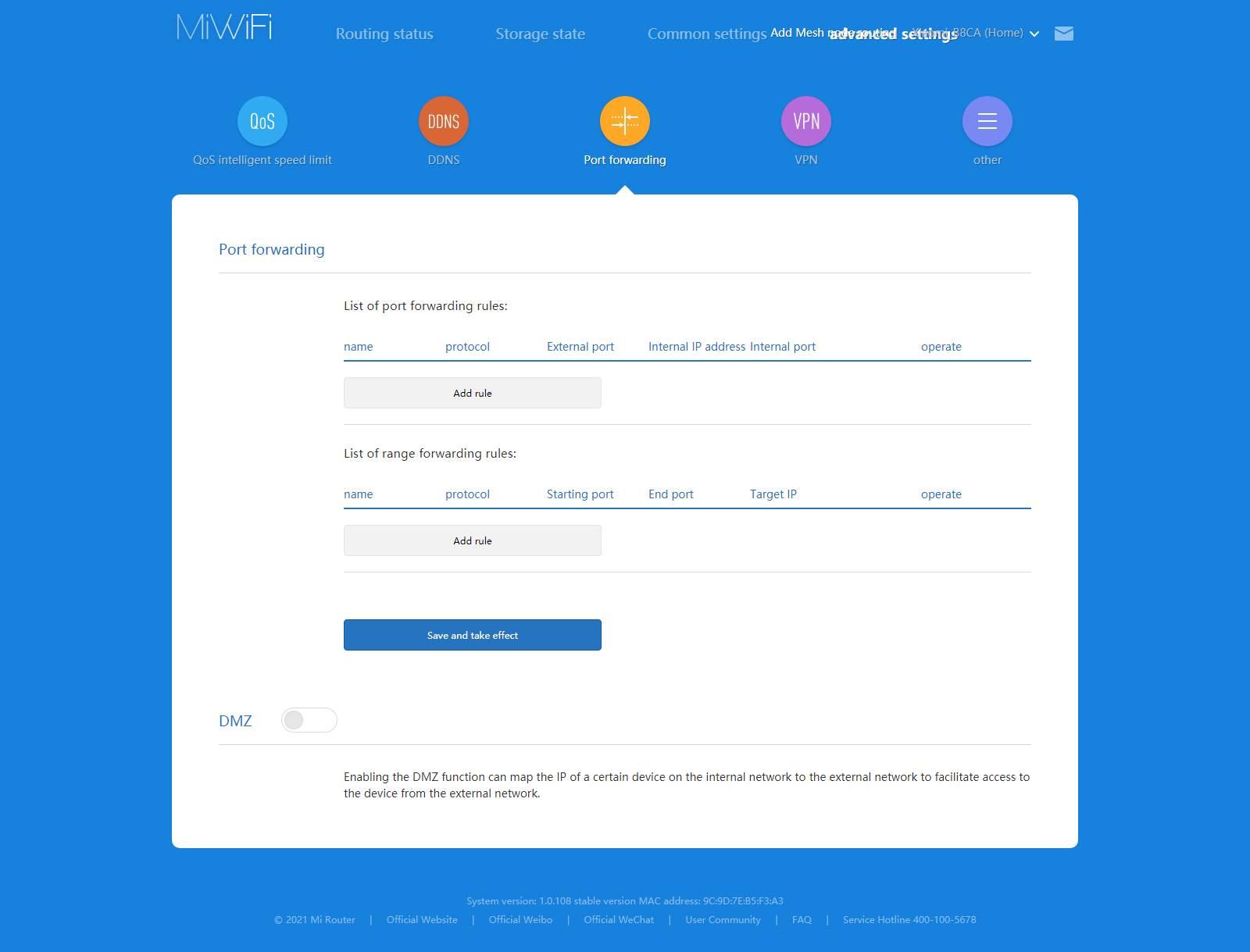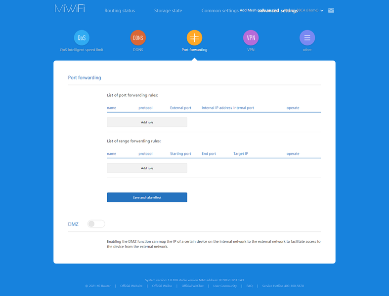 Настройки правил трансляции портов позволяют «пробрасывать» или индивидуальные порты или диапазоны. Причем в первом случае внешний и внутренний номера портов могут отличаться. Предусмотрена также поддержка технологии DMZ.