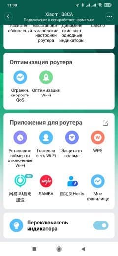 Наконец в «Приложения для роутера» мы увидели пункт гостевой беспроводной сети. Пользователь может выбрать имя, пароль и тип защиты. Работает гостевая сеть только в диапазоне 2,4 ГГц. Далее здесь есть настройка расписания отключения беспроводных сетей, аналог страницы «Брандмауэр» из приложения Mi WiFi, подключение клиентов по WPS, некий модуль «ускорения игр» на китайском языке, пакет SAMBA (вполне вероятно, что именно он позволил получить доступ ко всем томам на роутере), редактор файла hosts на роутере (позволяет заблокировать доступ из локальной сети к определенным доменным именам), модуль «Мое хранилище».