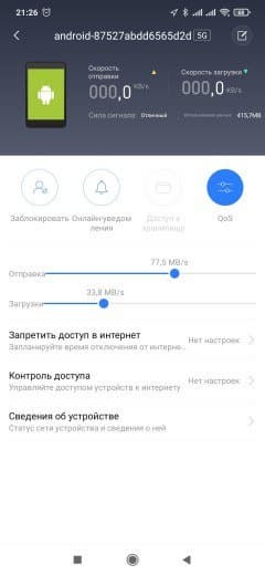Если перейти к конкретному клиенту, то будут доступны данные о текущих скоростях и объеме трафика (не понятно, за какой промежуток) и сила сигнала для беспроводных устройств. Пользователь может изменить имя клиента, заблокировать ему доступ к интернету или установить расписание доступа, включить уведомления при появлении клиента в сети, настроить ограничения на скорость загрузки и передачи, создать черный или белый списки сайтов. На последней странице можно уточнить MAC- и IP-адреса клиента, а также другую информацию о нем.