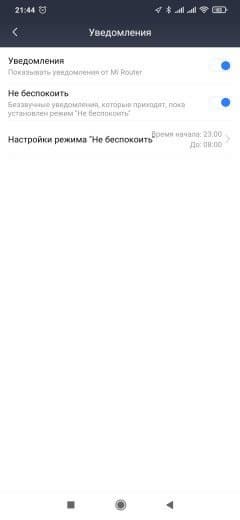 Отдельная группа страниц посвящена связыванию роутера с аккаунтом Mi. Напомним, что данная система позволяет также «делиться» доступом к управлению с другими пользователями облака. Ну и последние интересные настройки — уведомления с опцией выбора времени для режима «не беспокоить».