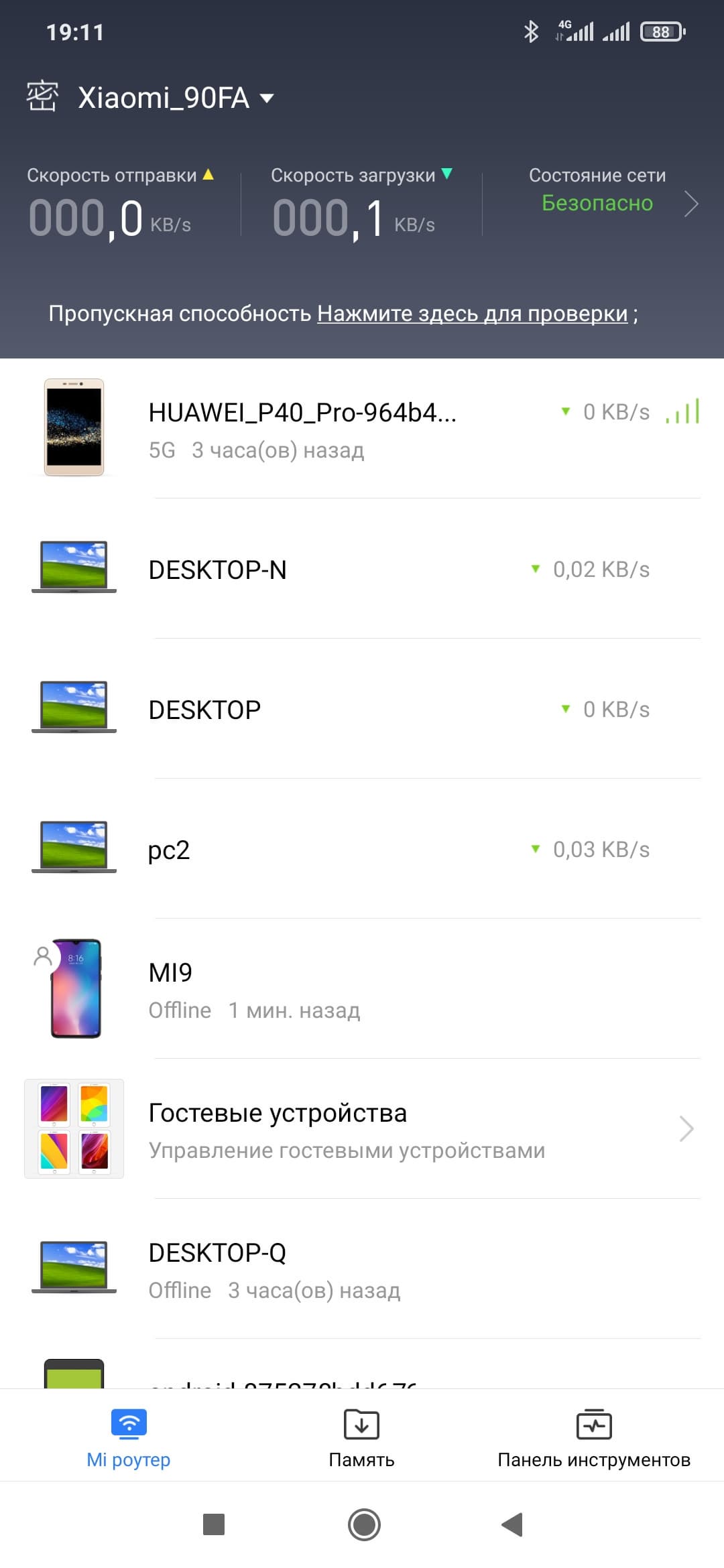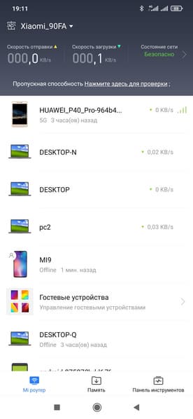 На главной странице (она соответствует пункту «Mi роутер» в нижней строке меню) мы видим текущие скорости отправки и передачи данных от роутера в интернет и список клиентов. При этом большинство элементов являются ссылками. Например, пункт «Состояние сети» приводит на страницу проверки ключевых параметров с точки зрения безопасности (в частности, оценивается сложность паролей) и настройки дополнительных фильтров защиты (включая список блокируемых клиентов).