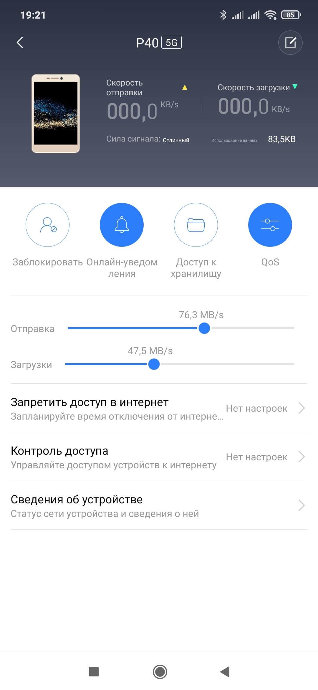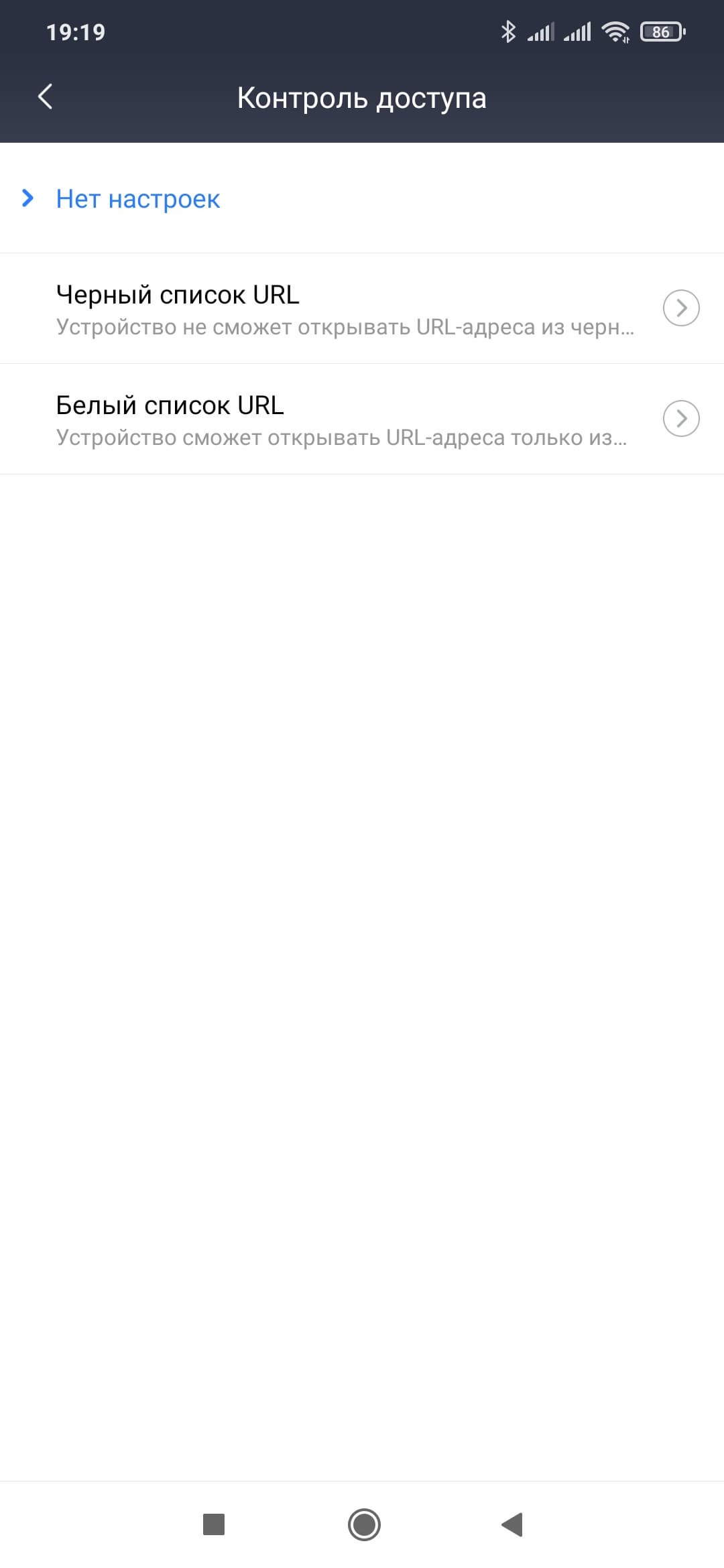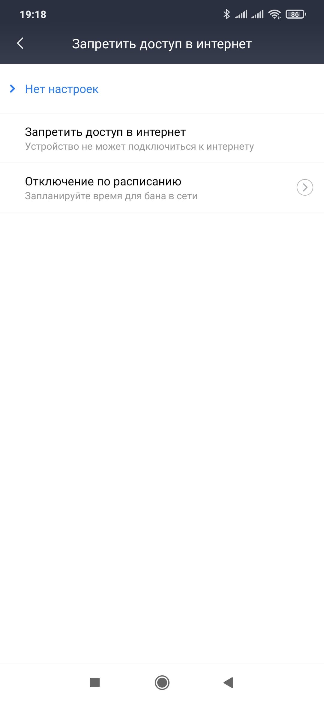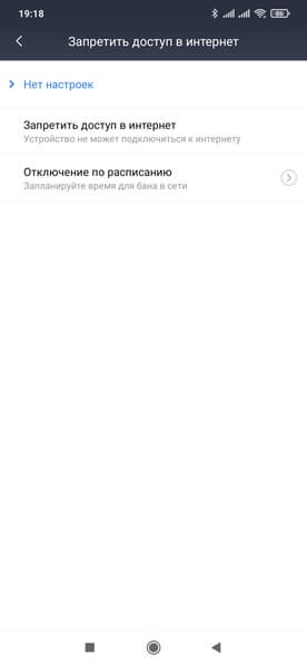 Выбор конкретного клиента из списка позволяет проверить тип его подключения, переименовать клиента, установить ему режим блокировки доступа к интернету (нет блокировки, постоянная, по расписанию), настроить черный или белый списки URL, ограничить скорости загрузки и скачивания.