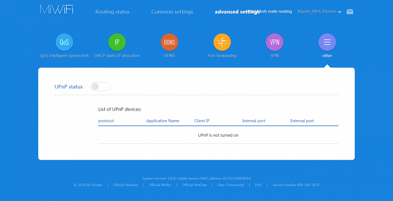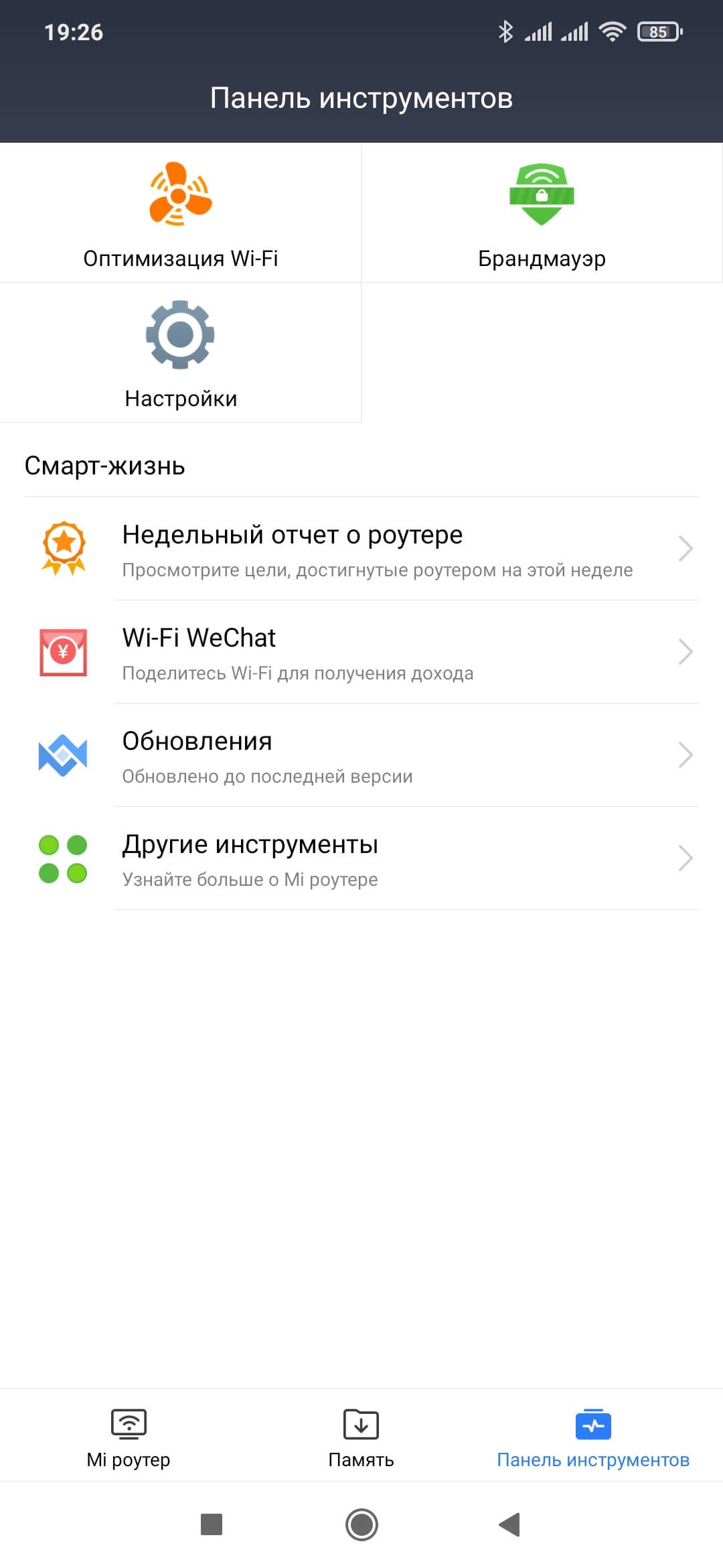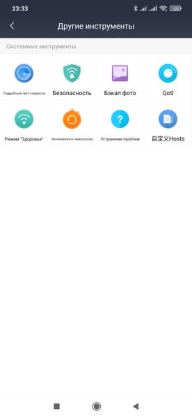 Остальные сервисы в основном мало интересны. «Недельный отчет о роутере» показывает некую интегральную статистику и только на китайском языке. Wi-Fi WeChat позволяет «делиться» вашим интернетом с другими пользователями этого сервиса. «Обновления» - еще один вариант проверки наличия новых версий прошивки.