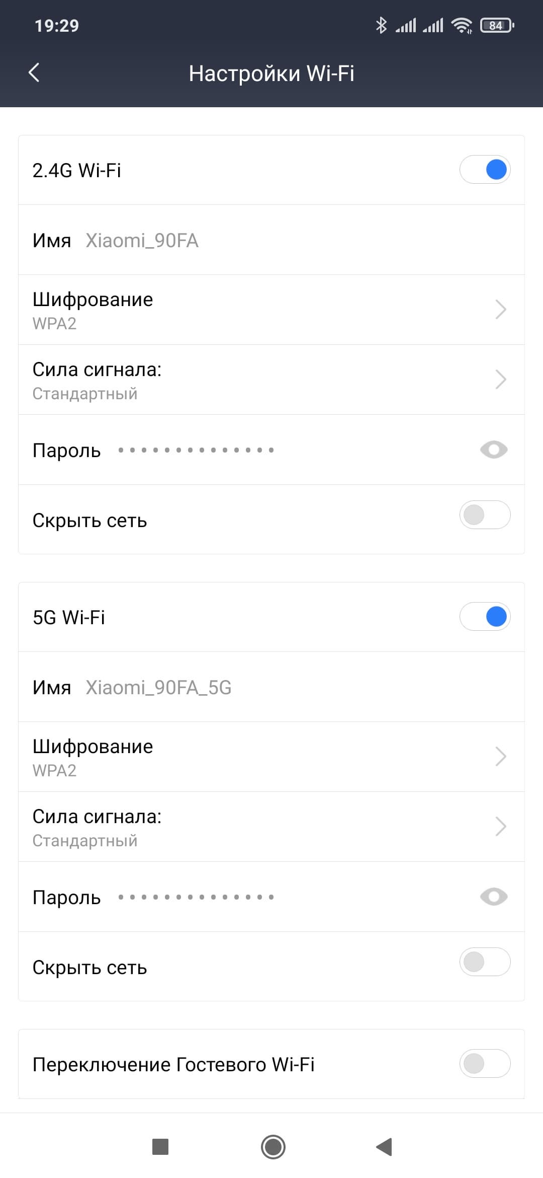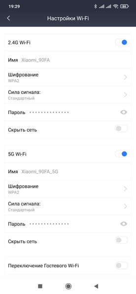 Пункт «Настройки» позволяет изменить большинство параметров работы устройства. Настройки Wi-Fi включают в себя выбор имен и паролей сетей для диапазонов 2,4 и 5 ГГц, а также для гостевой сети. В нашем случае некоторые опции по неизвестной причине не работали.
