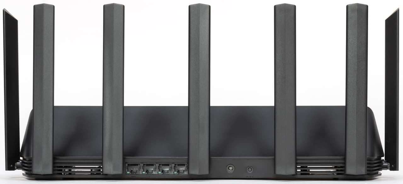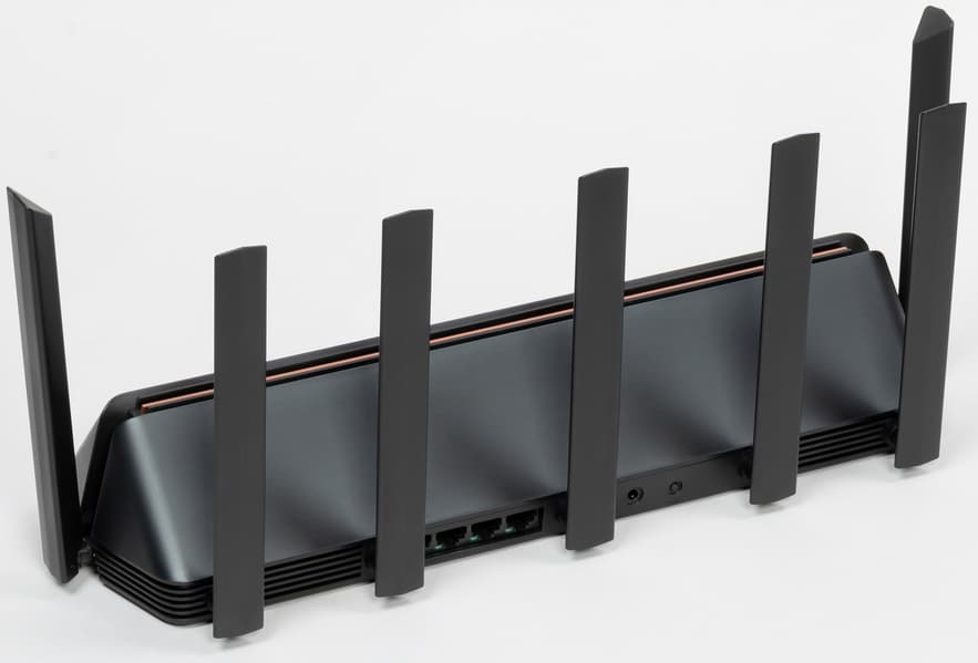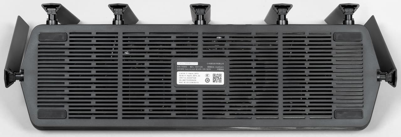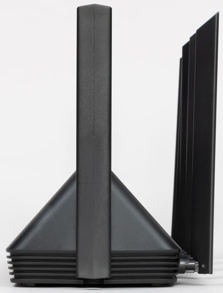Вся нижняя часть корпуса и дно выполнены в виде решетки вентиляции. На ребре сзади кроме антенн находятся четыре гигабитных порта с индикаторами, вход блока питания и кнопка сброса. Несмотря на крупный корпус, сетевые порты выполнены одним компактным блоком.