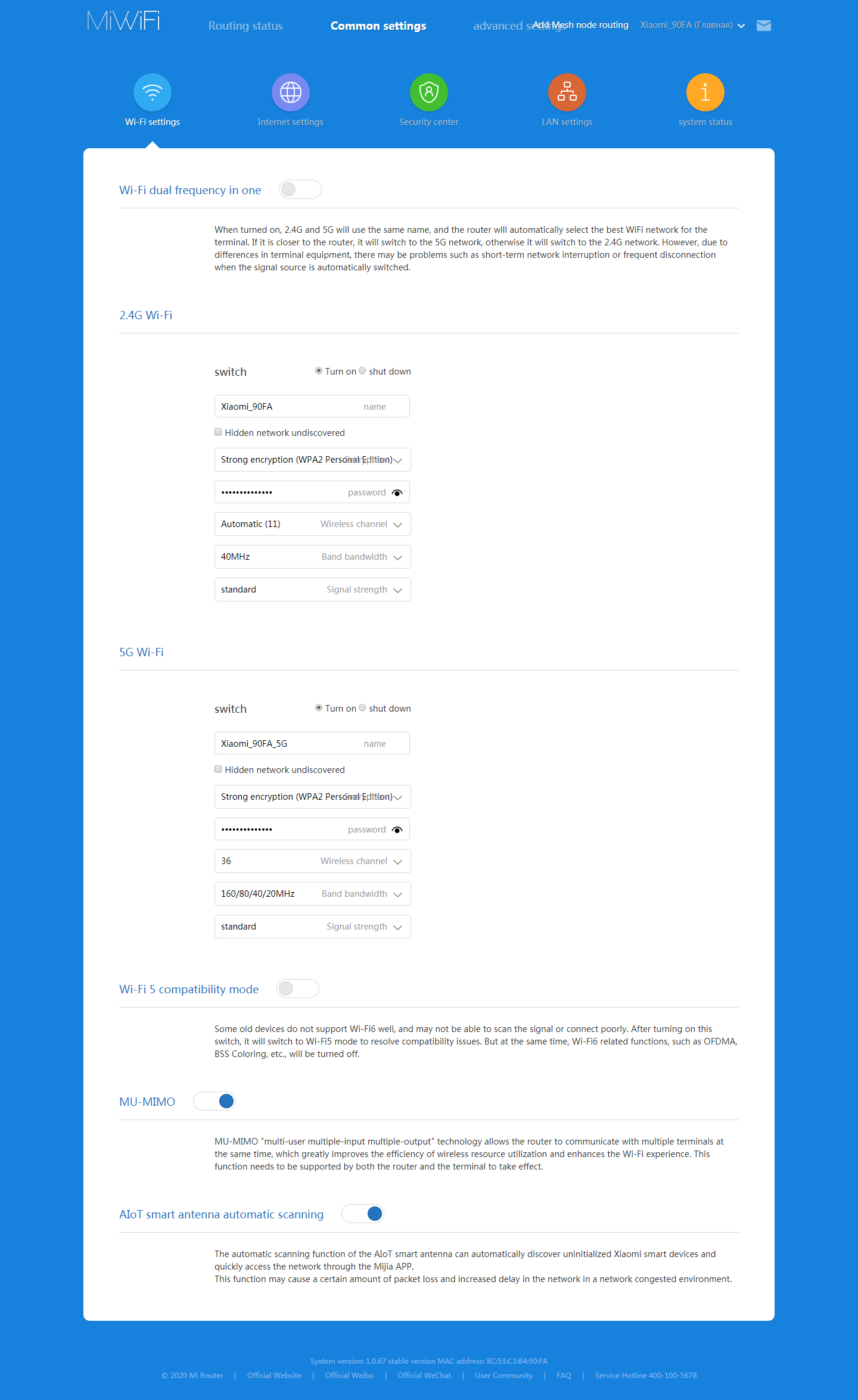 Основное меню общих настроек начинается со страницы с параметрами Wi-Fi. Здесь можно установить имена и пароли сетей, номера (для диапазона 5 ГГц поддерживаются 36—64 и 149—165) и ширину канала, мощность радиопередатчика, скрыть трансляцию имен, включить режим общего для двух диапазонов имени, отключить MU-MIMO и сервис AIoT.