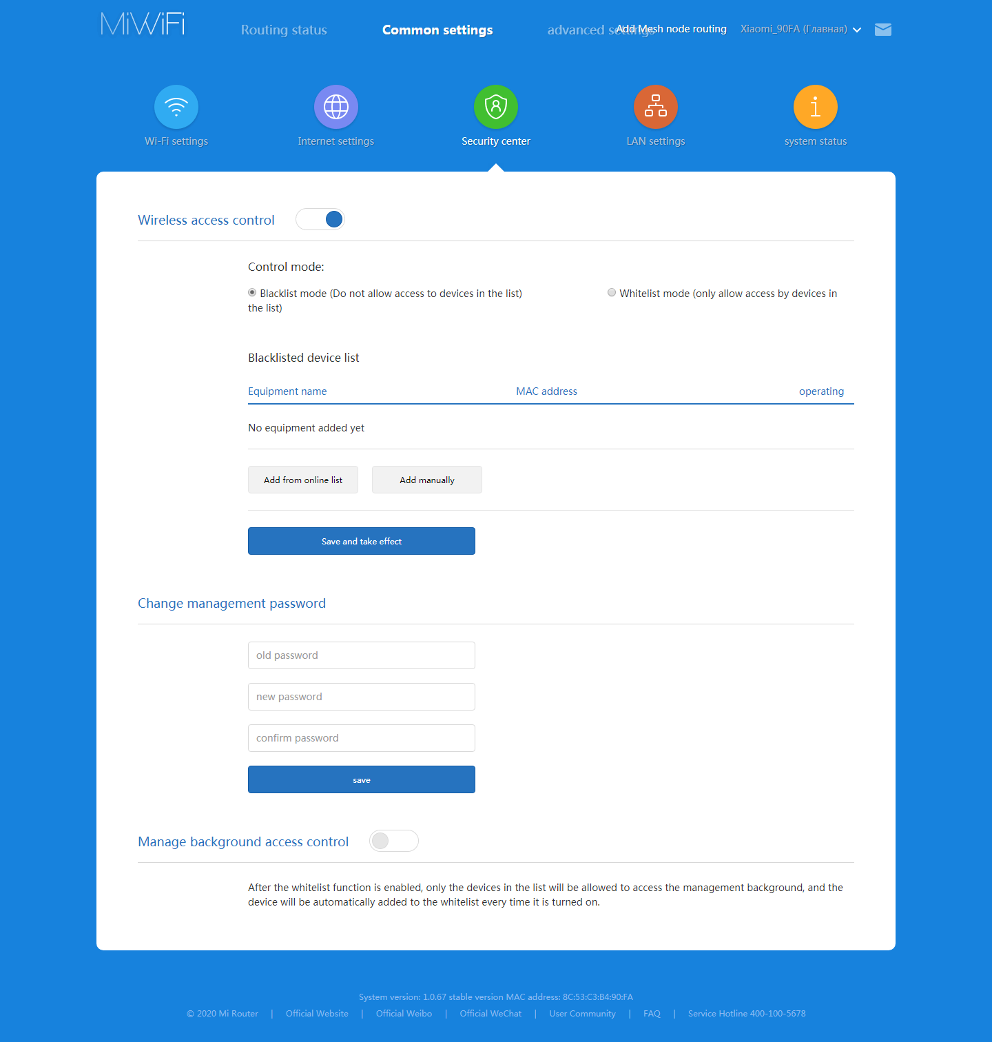 Страница «Security center» позволяет настроить черный или белый списки доступа по Wi-Fi и поменять пароль администратора (после прохождения мастера настройки он совпадает с паролем от Wi-Fi).