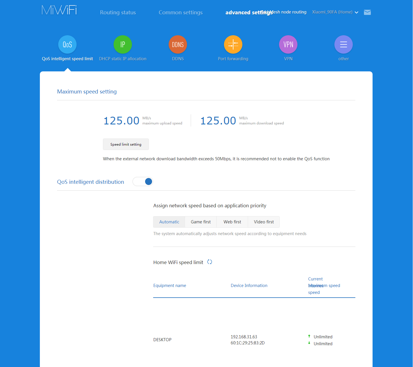 В дополнительных настройках представлены опции сервиса управления полосой пропускания QoS, где можно ограничить скорости клиентам и выставить приоритет определенному виду трафика (игры, видео, сайты).