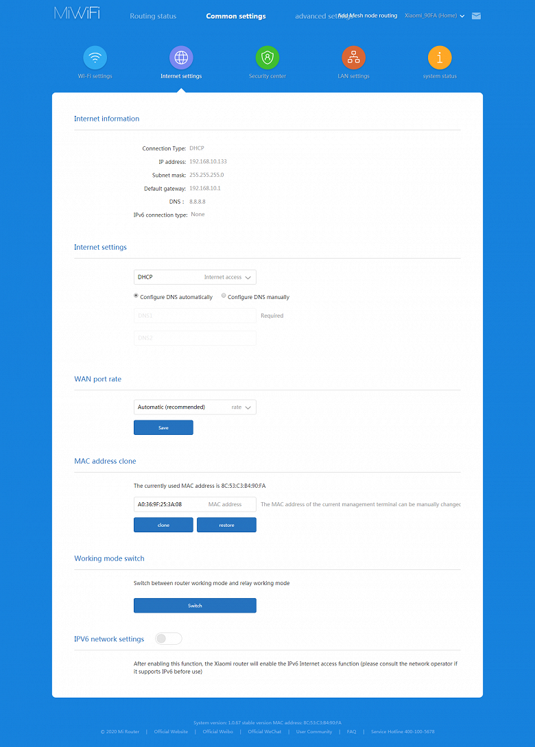 Штатно поддерживается подключения к интернету по IPoE и PPPoE. Есть пункт замены MAC-адреса порта WAN и опция включения IPv6. Здесь же можно отключить режим маршрутизатора и превратить устройство в точку доступа.