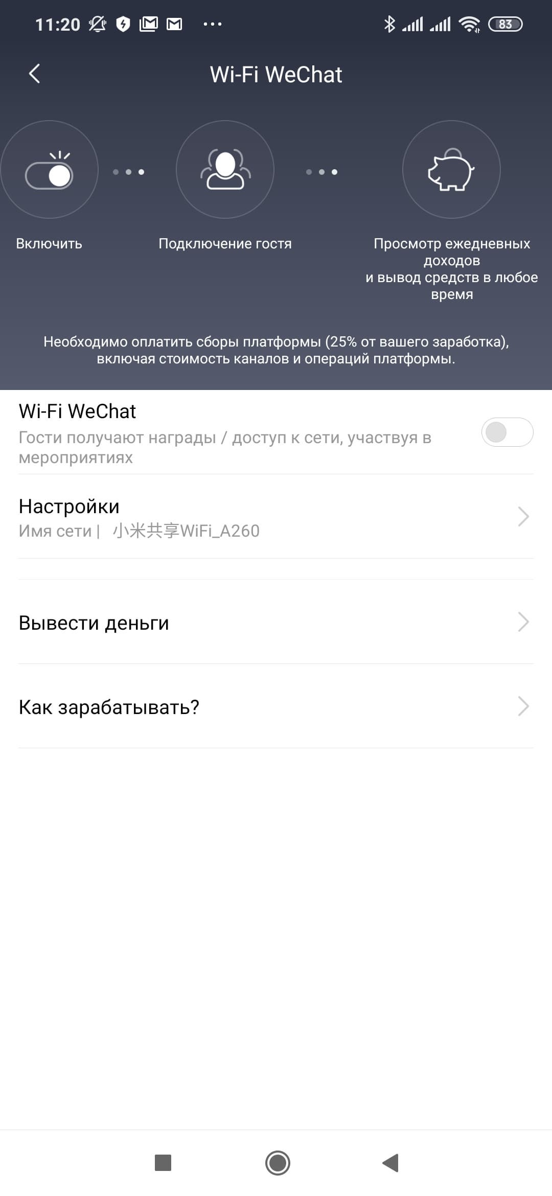 Сервис Wi-Fi WeChat позволяет вам зарабатывать, предоставляя доступ к интернету через свой роутер другим участникам сервиса. У нас данная функция вероятно не будет работать, учитывая законодательные и другие ограничения.