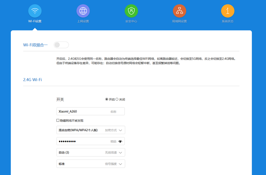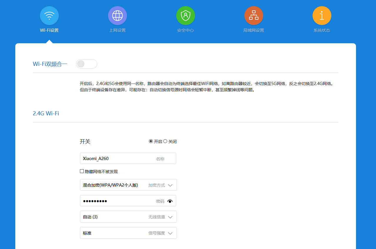 Вторая группа меню позволяет настроить сети Wi-Fi. Для них можно указать имя, пароль, номер канала, мощность передатчика. Также можно включить режим одного имени для двух диапазонов, так что роутер будет стараться предоставлять клиентам оптимальный для них вариант. Для диапазона 5 ГГц можно также выбрать ширину канала. Что касается вариантов каналов для 5 ГГц, то в роутере есть поддержка 36—48 и 149—165.
