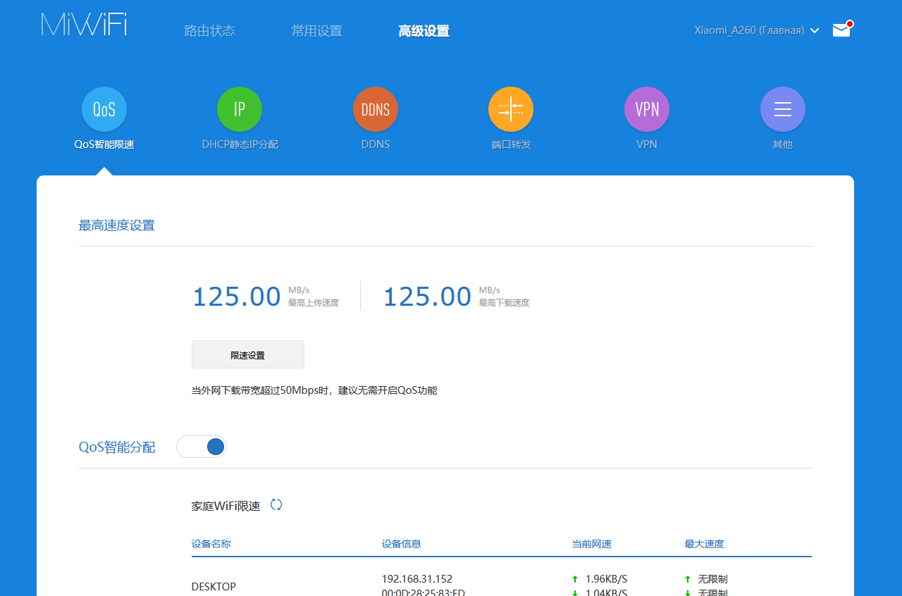 В третьей группе собраны расширенные настройки устройства. Функция QoS позволяет для каждого клиента локальной сети установить ограничения скорости загрузки и передачи. При этом для работы сервиса необходимо также указать возможности канала.