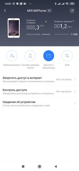 На основной странице представлена основная информация об устройстве, в частности текущие скорости обмена данными с интернетом и список подключенных клиентов. При выборе клиента можно настроить для него ограничение доступа к интернету (постоянное или по расписанию), белый и черный списки URL, приоритизацию трафика (QoS), уведомления при появлении в сети, изменить имя устройства, посмотреть текущие скорости загрузки и скачивания, общий объем переданных данных.