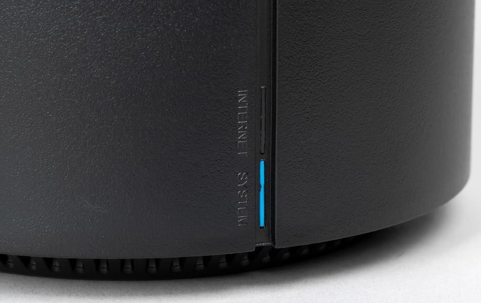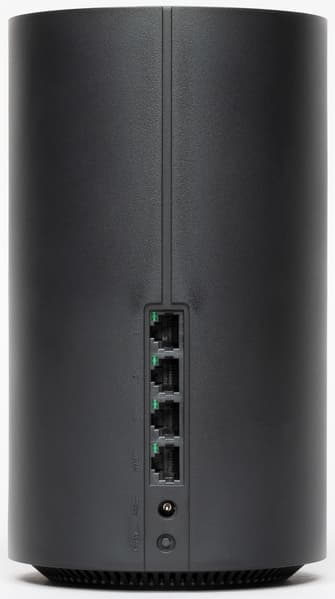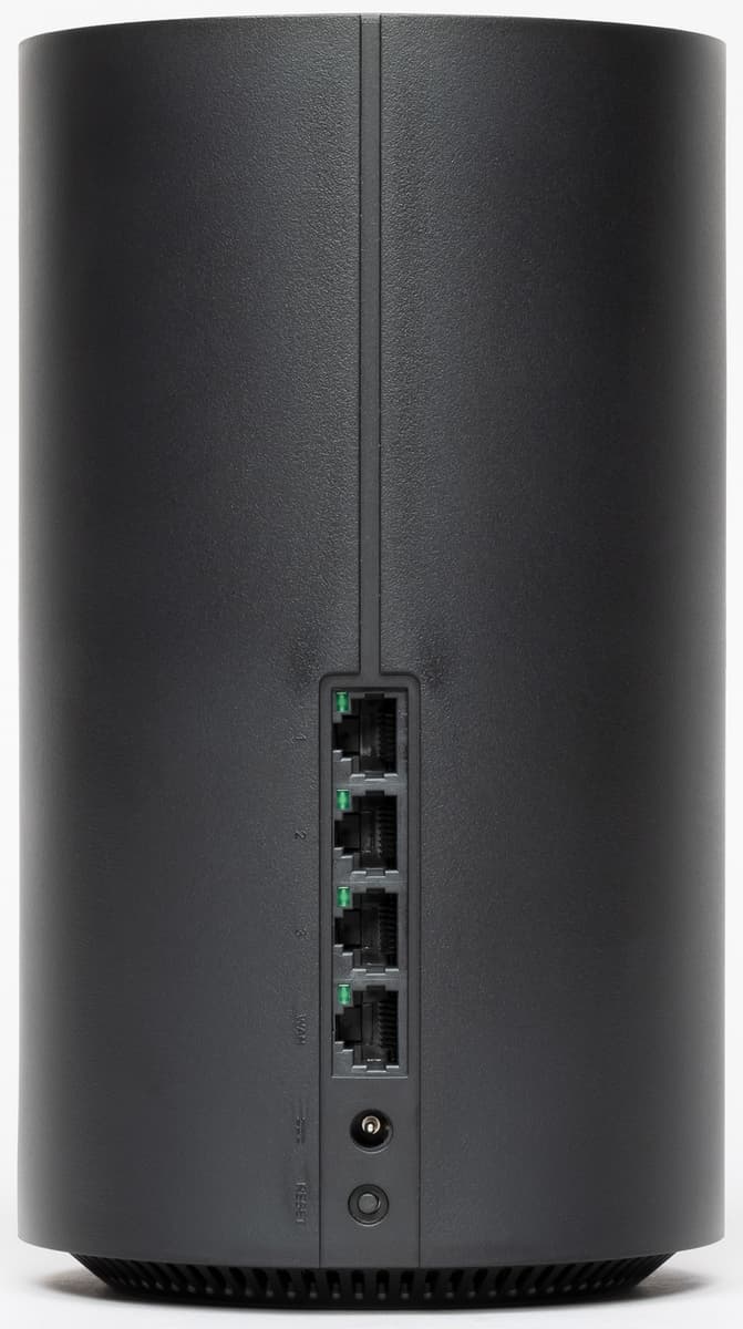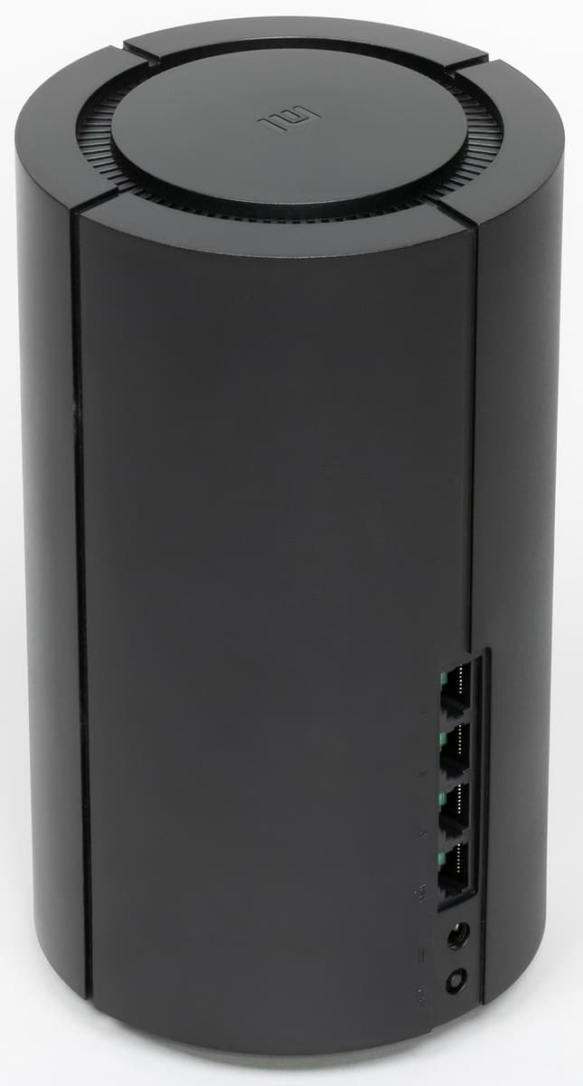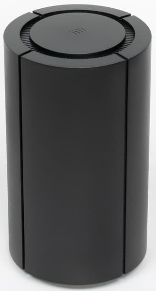 Корпус роутера выполнен в формате вертикального цилиндра. Высота составляет 21 см, диаметр — 12 см. Материал корпуса — черный матовый пластик. Вариант установки только один — на горизонтальную поверхность. На дне есть резиновое кольцо, которое надежно удерживает роутер на месте, а также решетки вентиляции и информационная наклейка.