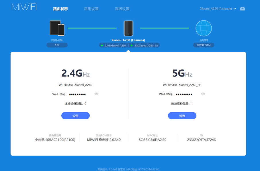 На главной странице традиционно представлена информация о состоянии устройства, подключенных клиентах, общем объеме трафика, именах и паролях беспроводных сетей, а также модель, прошивка, MAC-адрес и серийный номер роутера.