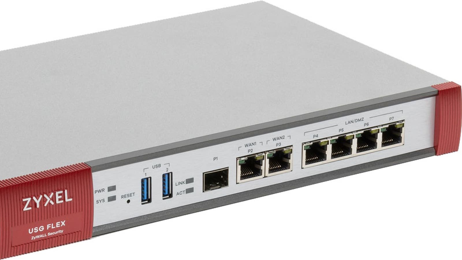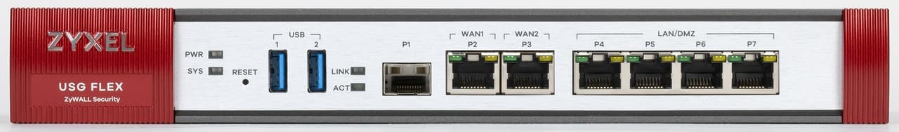 Рассматриваемое решение основано на закрытой платформе, так что подробности аппаратной конфигурации не играют большой роли для потребителя. Поэтому опишем здесь только «внешние» характеристики и заявленные производителем скорости работы в разных режимах. Всего в Zyxel USG Flex 200 есть семь гигабитных портов — шесть для медного кабеля (RJ45) и один слот для модулей SFP. Из первых два предназначены для подключения к провайдерам (WAN), а четыре — для устройств локальной сети (LAN). Что касается слота SFP, то его роль можно выбрать в настройках. Таким образом, можно реализовать конфигурации 2×WAN+5×LAN или 3×WAN+4×LAN. Дополнительно на лицевой стороне корпуса расположены два порта USB 3.0, которые могут использоваться для подключения накопителей (в частности, для записи журнала событий) или для модемов сотовых сетей с целью реализации дополнительных подключений к интернету. На задней панели расположен последовательный порт DB9 для доступа к консоли маршрутизатора.