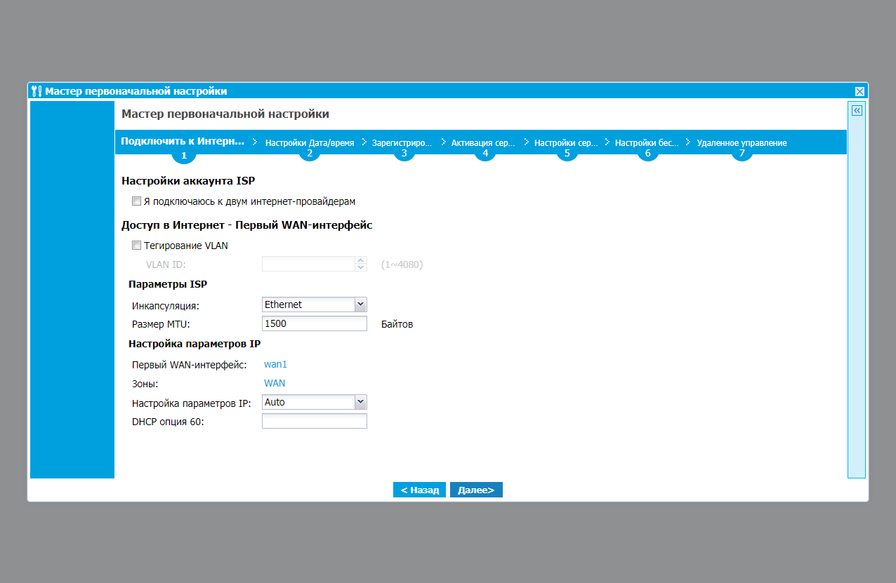 После повторного входа с новыми данными предлагается пройти мастер первой настройки из нескольких страниц. На первой настраиваем подключение к провайдеру. Сразу же можно проверить статус подключения. Далее идет настройка встроенных часов в полностью автоматическом (включая часовой пояс) варианте при условии наличия подключения к интернету. Следующие пункты — регистрация устройства в аккаунте myzyxel и лицензирования подписок.