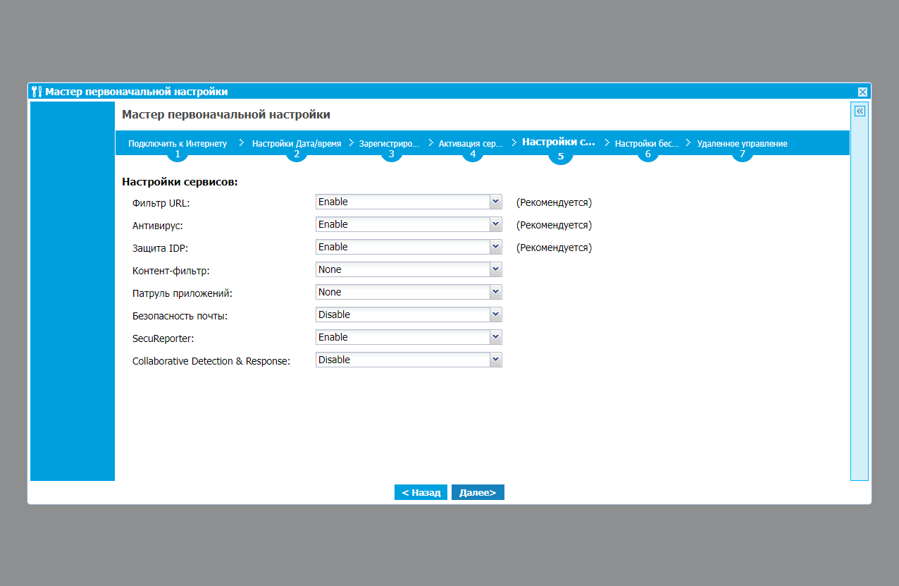 По умолчанию, предлагается сразу же активировать такие функции как фильтр URL, антивирус и IDP, а также разрешить сервис SecuReporter, автоматически присылающий по электронной почте ежедневные отчеты о работе шлюза. Если у вас есть точки доступа данного бренда, то USG может выступать в роли контроллера для них. Опция по включению этой функции также есть в мастере настройки.