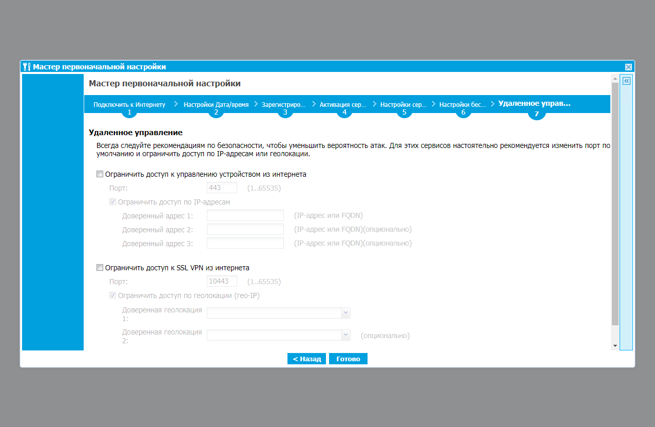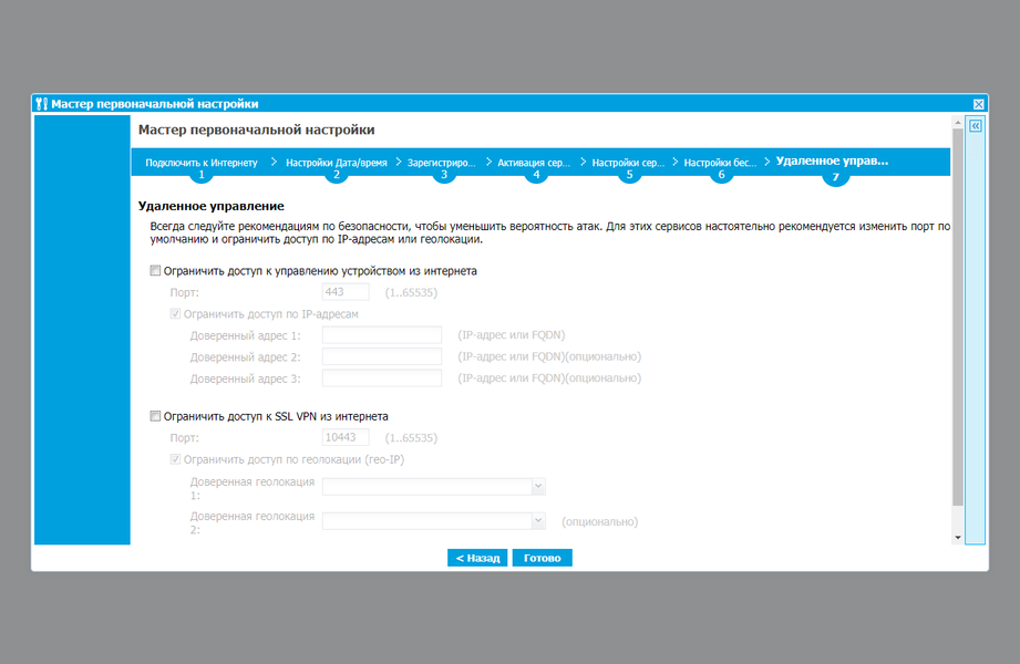 На последней странице можно разрешить удаленное подключение к веб-интерфейсу шлюза, а также настроить порт и ограничения по регионам для сервиса SSL VPN.