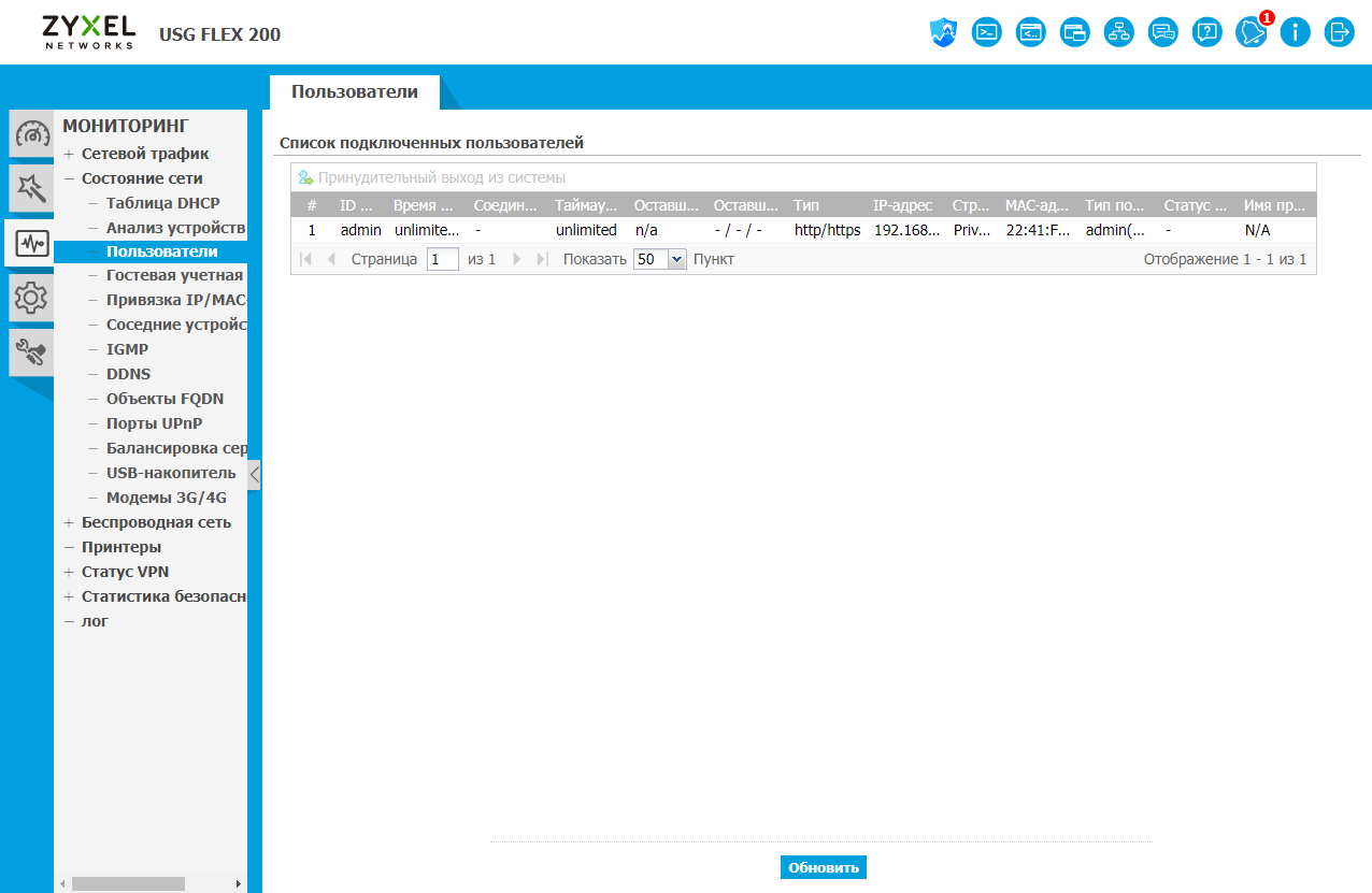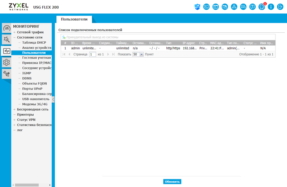 Вторая страница, «Состояние сети», поможет проверить работу внутренних сегментов сети. Здесь есть данные аренды адресов DHCP, подключенные пользователи, открытые по UPnP порты. Заметим, что информация по маршрутизации приводится в разделе «Обслуживание». Еще из полезного — статусы работы сервисов VPN с возможностью принудительного отключения клиента.