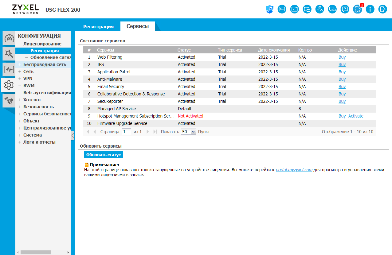 Напомним, что для всех NGFW обязательно своевременное обновление баз сигнатур атак, классификации сайтов, приложений и так далее. Иначе устройства могут просто не обеспечивать требуемый уровень безопасности. Так что регистрация обязательна, а что касается подписок, то новым покупателям предоставляется тестовый период в один месяц на все подписки, далее потребуется оформление отдельного контракта. Удобнее всего будет приобрести предлагаемый комплект лицензий, который включает все основные сервисы. При этом некоторые функции, в частности связанные с обслуживанием беспроводных клиентов, лицензируются отдельно.