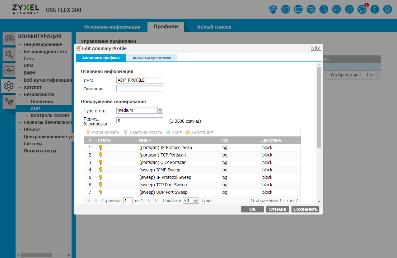 На второй странице раздела настраиваются профили системы обнаружения аномалий трафика. В частности, здесь можно отключить детектирование сканирований, флуда, некорректных значений полей пакетов IP.