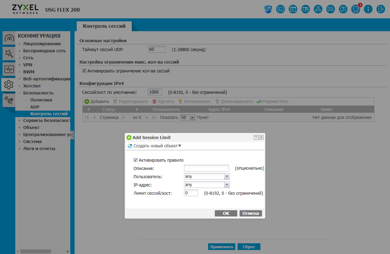 Функция контроля сессий позволяет установить таймаут на сессии UDP (общий для всего шлюза) и ограничения на число сессий на хост (здесь можно указать индивидуальные значения для выбранных клиентов).