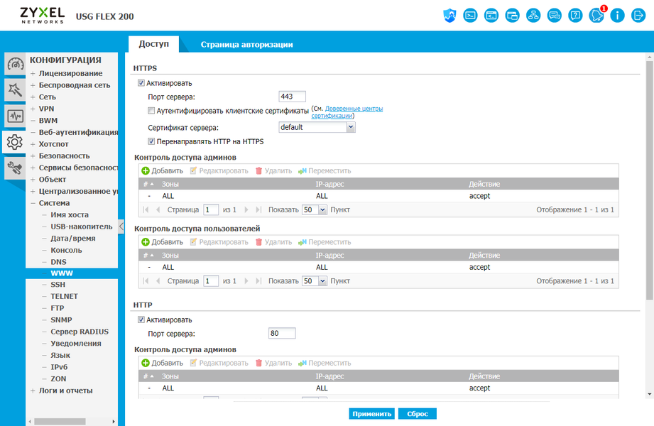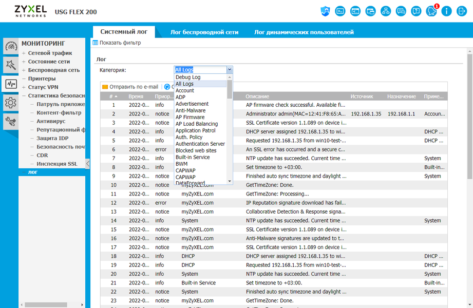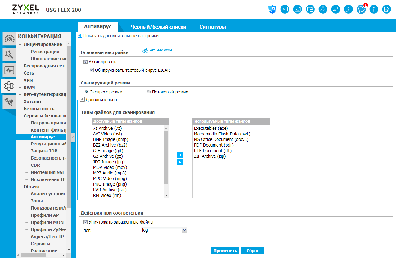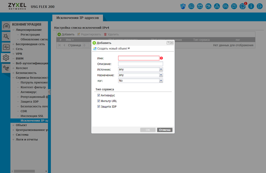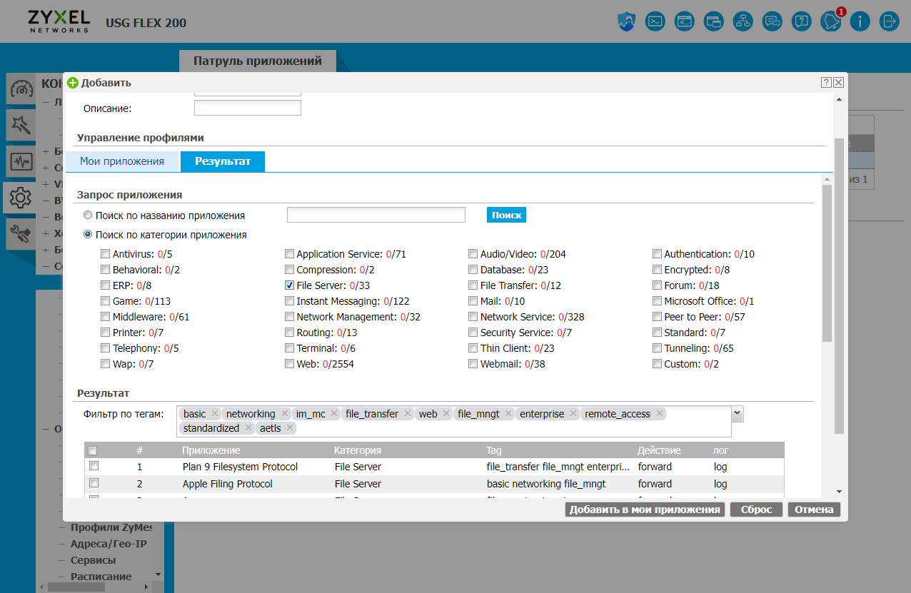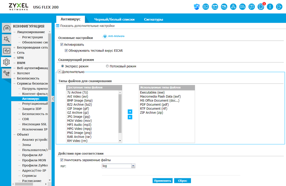 И если задачи маршрутизации и удаленного доступа сегодня могут быть реализованы различными продуктами, то межсетевой экран класса NGFW — это уже совсем другая история, требующая высокой компетенции от разработчиков. В решениях Zyxel USG Flex реализованы такие сервисы, как система предотвращения вторжений, контроль приложений, антивирус, антиспам, контентная фильтрация, определение аномалий трафика, контроль сессий, а также SSL-инспекция. При этом базы сигнатур регулярно обновляются производителем на основе подписки. Для настройки работы системы используется принцип объектов, а в правилах могут быть использованы такие параметры, как пользователи и группы, адреса, подсети (включая географическое распределение), сервисы и расписания. Важным элементом системы защиты являются функции отчетности и автоматического реагирования на угрозы.
