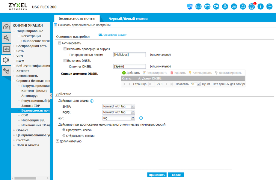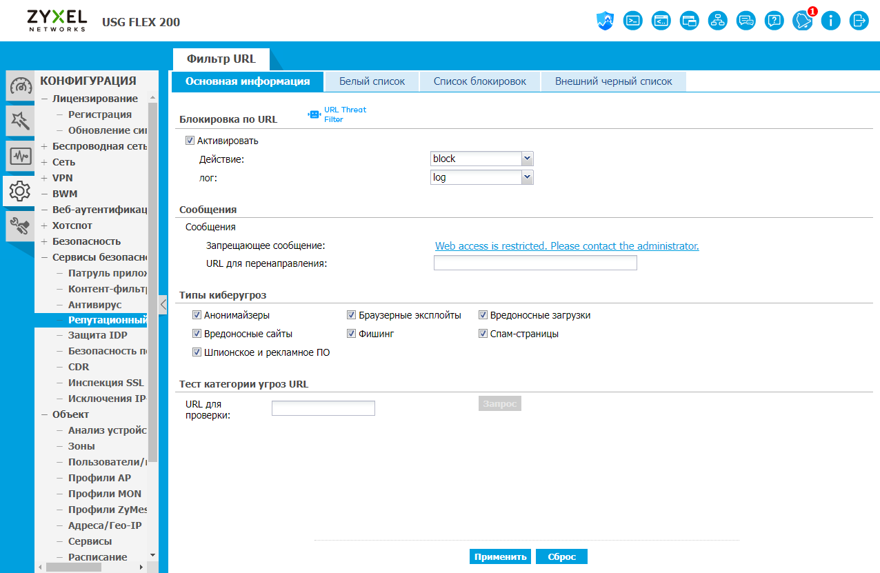 Репутационный фильтр URL является еще одним общим сервисом. Здесь вы можете настроить блокировку и логирование различных типов киберугроз. Кроме белого и черного списке в данном сервисе есть возможность и подключения внешней дополнительной базы для проверки ссылок.