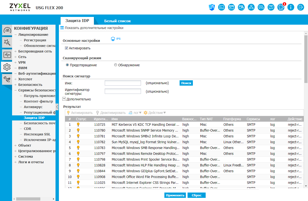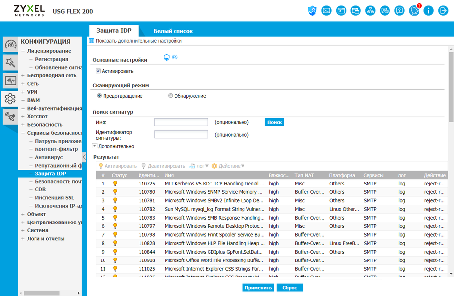 Система предотвращения вторжений работает с обновляемой базой сигнатур, а также допускает составление собственных правил. В настройках вы можете отключить обнаружение выбранных угроз или изменить действие для них. Данный сервис также настраивается сразу для всего шлюза.