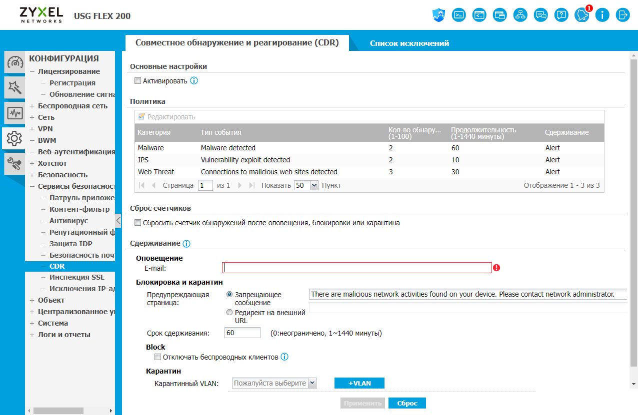 Функция CDR («Совместное обнаружение и реагирование») позволяет автоматически блокировать клиентов локальной сети в случае их заражения. В настройках определяются пороги (число срабатываний за указанный промежуток времени) и предпринимаемые действия.