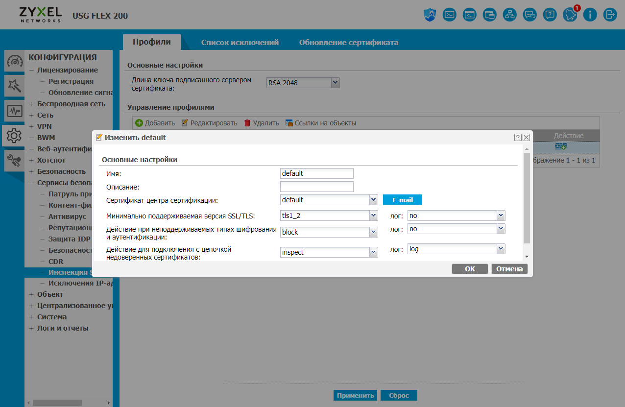 - Включение всех сервисов и инспекции SSL — «maximum+SSL»