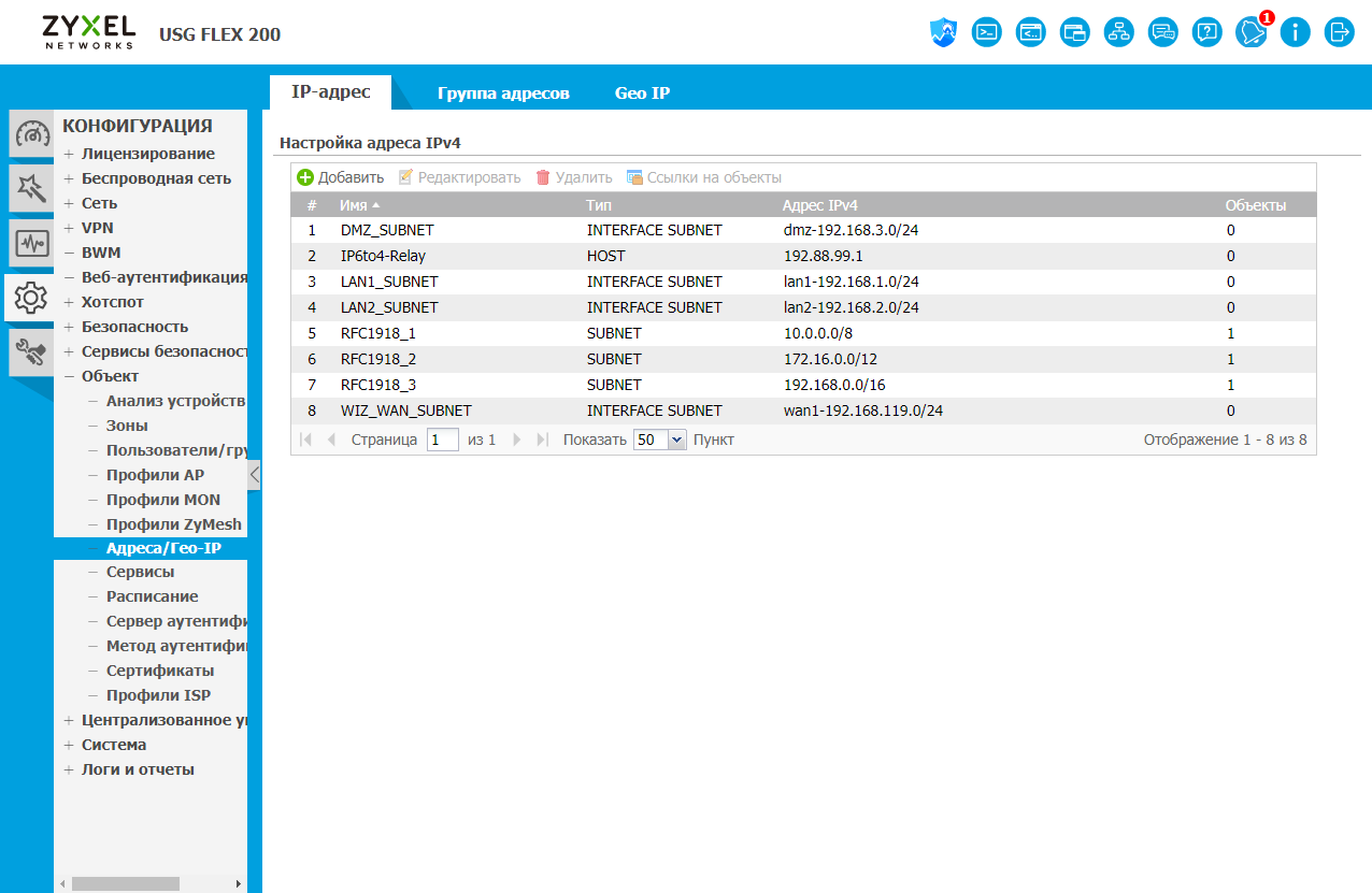 Для удобства настройки шлюза активно используется технология объектов. Это позволяет существенно упростить работу и обеспечить более прозрачное и простое управление. В качестве примеров можно привести пользователей и группы, зоны (группы интерфейсов), IP-адреса (включая подсети, группы и географические объекты), сервисы, расписания и так далее.