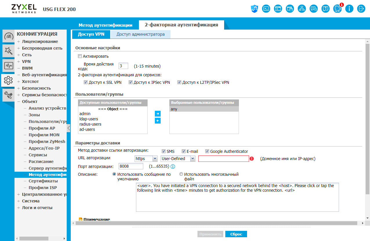 Есть в шлюзе и двухфакторная аутентификация для администраторов (доступ к веб-интерфейсу) и аккаунтов VPN.