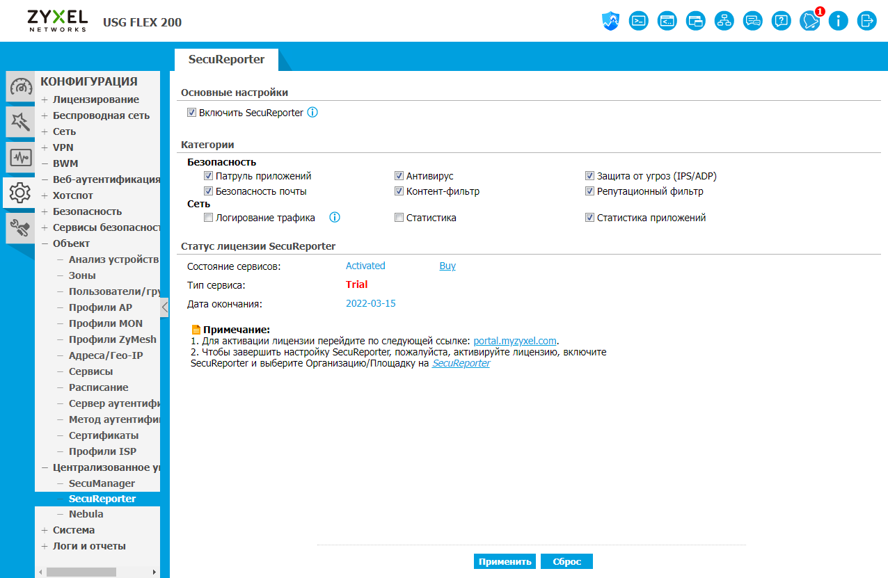 Как мы писали выше, шлюз может быть интегрирован в облачную систему управления Nebula. Кроме того, компания предоставляет сервис SecuReporter для составления регулярных отчетов о работе систем защиты.
