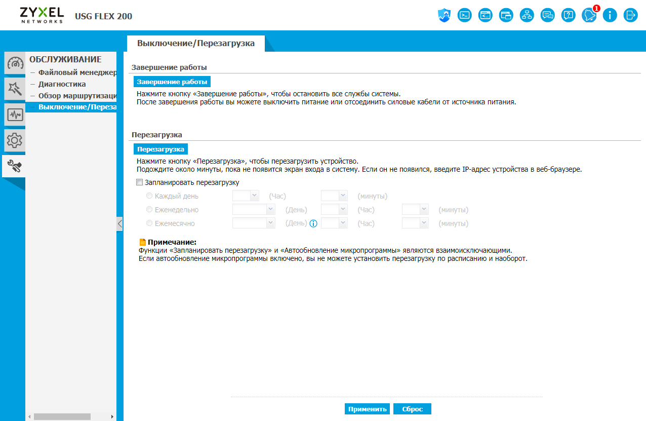 Предусмотрены и операции безопасного выключения устройства, а также перезагрузки, включая расписание для этого действия.