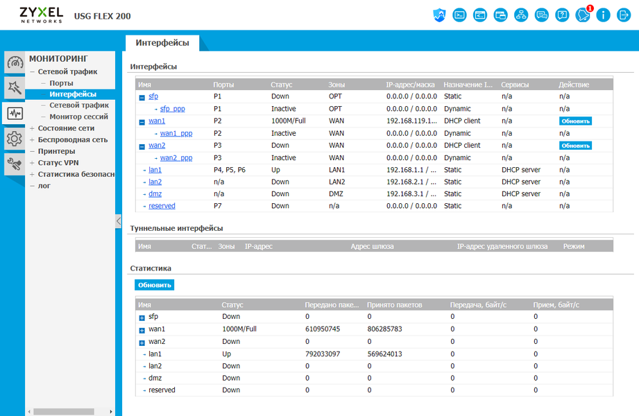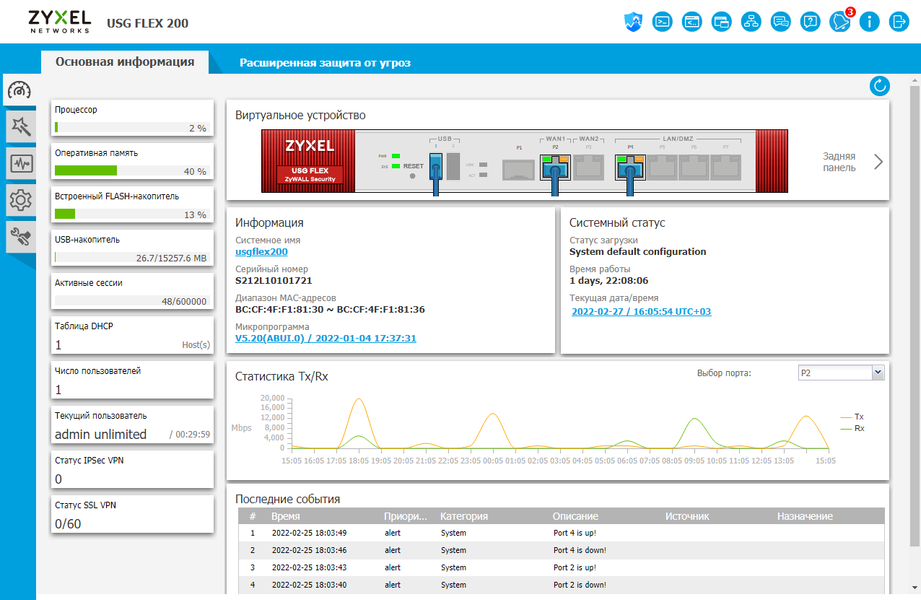 При входе пользователь видит страницу с общей информацией о текущем состоянии устройства, включая графическое изображение модели и подключенных портов, графики трафика, данные по нагрузке на процессор и оперативную память, число активных сессий, число подключений VPN. При этом некоторые элементы здесь являются ссылками. Например, при клике на данные по процессору будет показан график нагрузки, а при наведении на сетевой порт — скорость, зона и адрес.