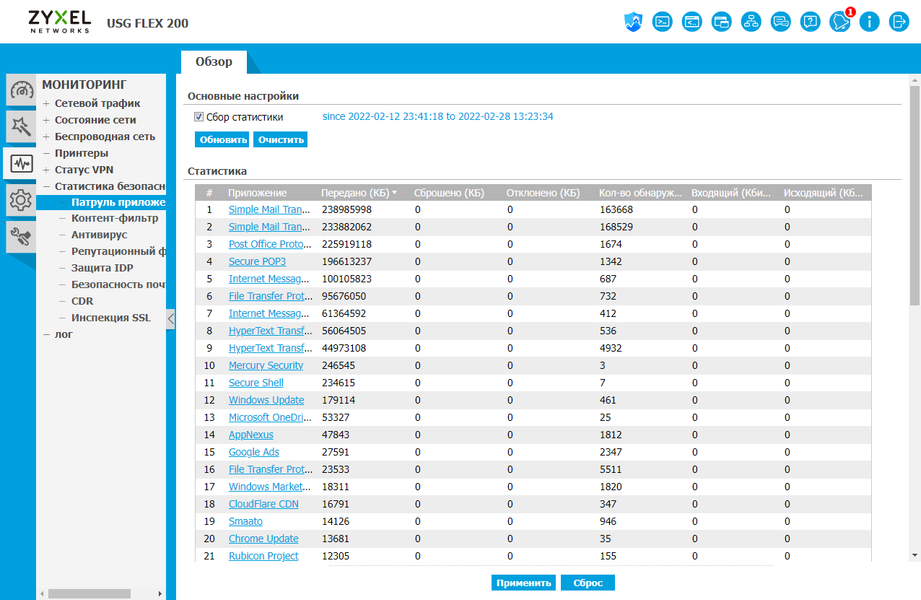 В группе «Статистика безопасности» можно проверить работу настроенных политик и сервисов. К примеру, для контроля приложений здесь будут данные по объемам трафика, для фильтров контента и DNS — число пропущенных и заблокированных запросов, для антивируса — имена обнаруженных «зловредов» и IP-адреса получателя и отправителя, для IDP — данные по определенным системой сигнатурам атак и так далее.