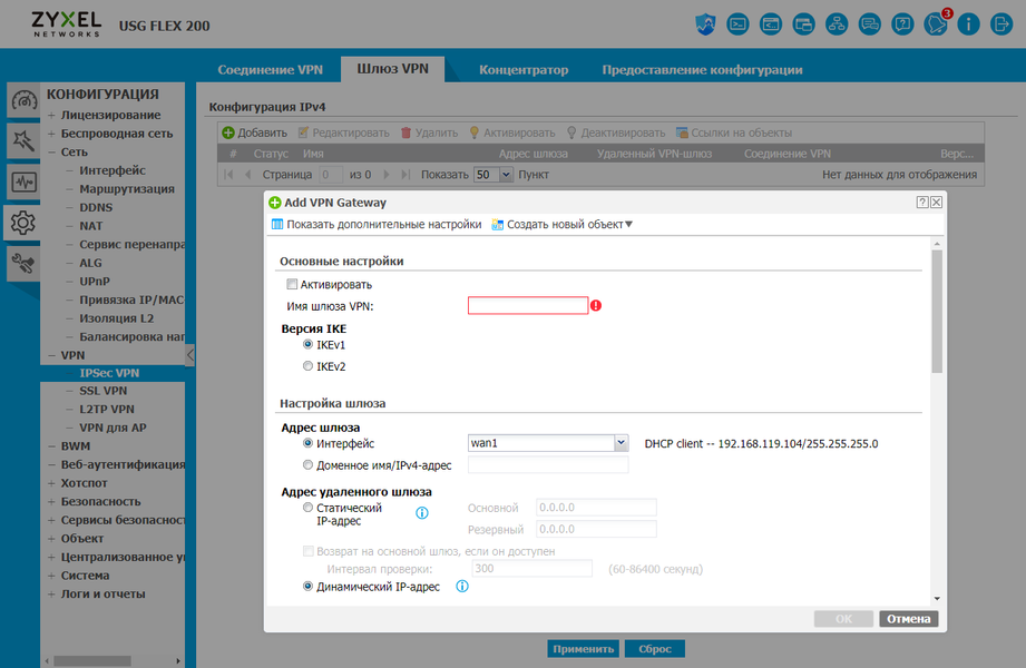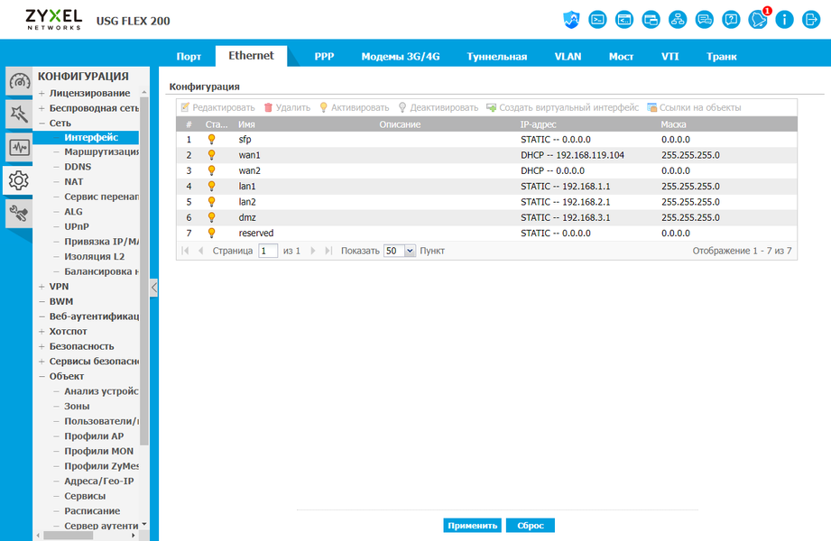 Много страниц отводится под настройки сетевых интерфейсов. В частности, для подключения к интернету могут быть использованы технологии IPoE, PPPoE, PPTP и L2TP. Поддерживаются туннельные интерфейсы, подключения IPSec, сотовые модемы, VLAN.